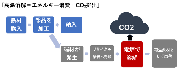 当社が製造する四輪車用電動パワーステアリング部品(以下スペーサー)の製造工程では、年間約24トンの端材が発生しています。通常、この端材は電炉で溶解し鉄材として再利用されますが、その過程で多量のCO2が排出され環境負荷が生じています。
