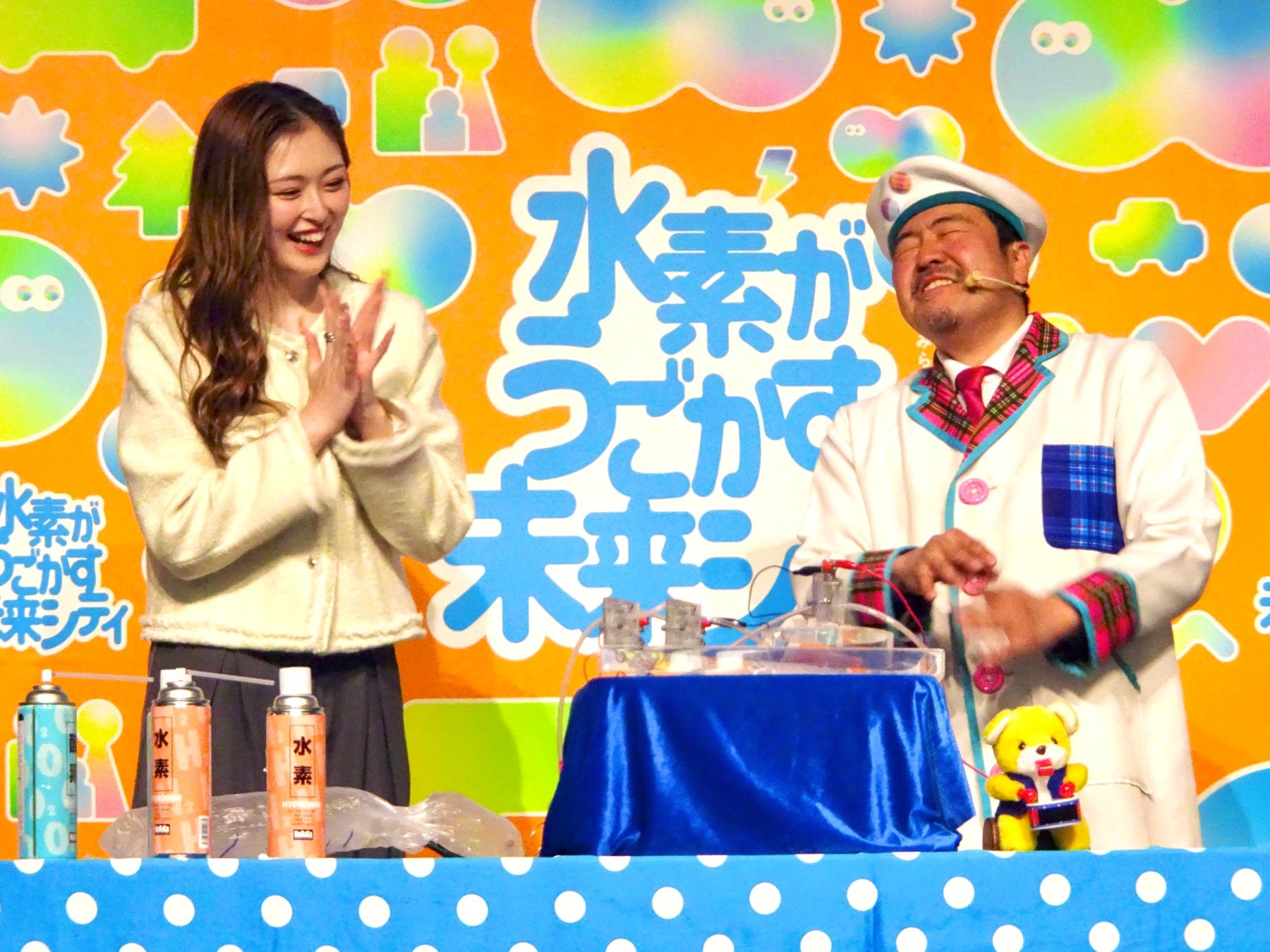 セレモニーにはゲストのゆうちゃみさんも登場し、サイエンスエンターテイナーのチャーリー西村さんと共に、水素の軽さを知る実験や、水素で電気を作る燃料電池の実験に挑戦。水素で作った電気でおもちゃが勢いよく動き出す様子に、ゆうちゃみさんは驚きの声を上げ、会場は大いに盛り上がりました。