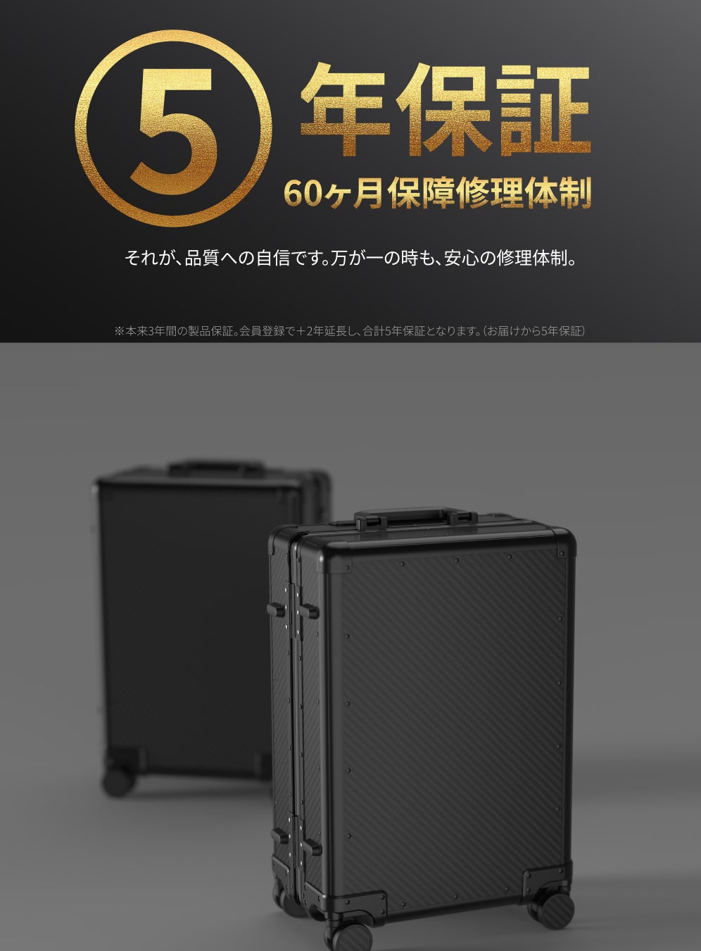 同じ30〜40L級・機内持ち込みクラスで、カーボン外装×アルミ合金フレームという同条件の製品を比較しても、当社モデルは約3.5kgと最軽量級に位置します。一般的な同カテゴリー品が4〜5kgに分布する中で、この差は数字以上に体感として現れます。スーツケースが軽いというだけで、旅の質は大きく変わります。