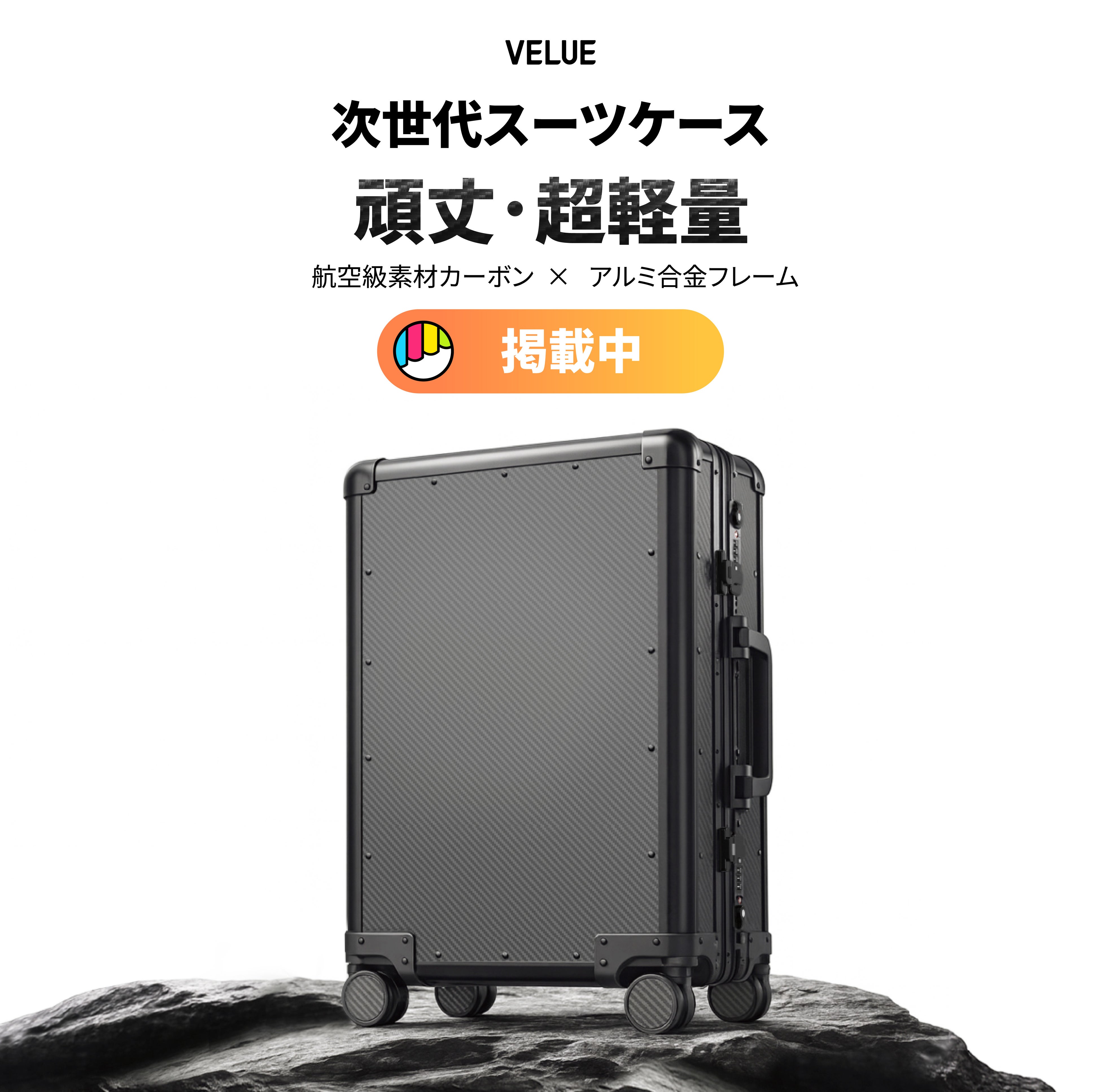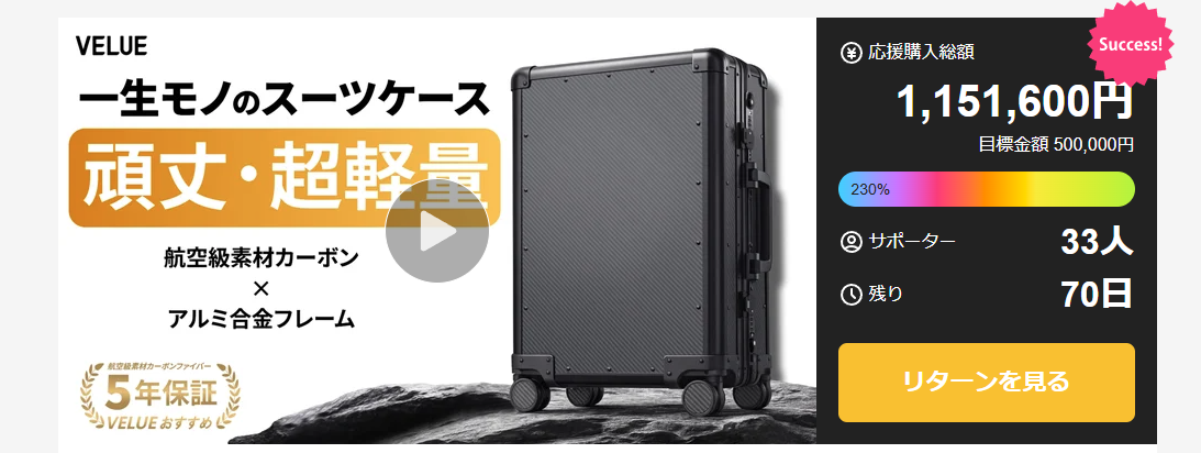 株式会社日進(本社:東京都荒川区)は、応援購入サービスMakuakeにて先行販売中の、『くて強いカーボンファイバー採用。長く愛せる一生モノのスーツケース|VELUE』プロジェクトが、僅か5時間で目標金額の230%を達成、総額115万円を超えました。