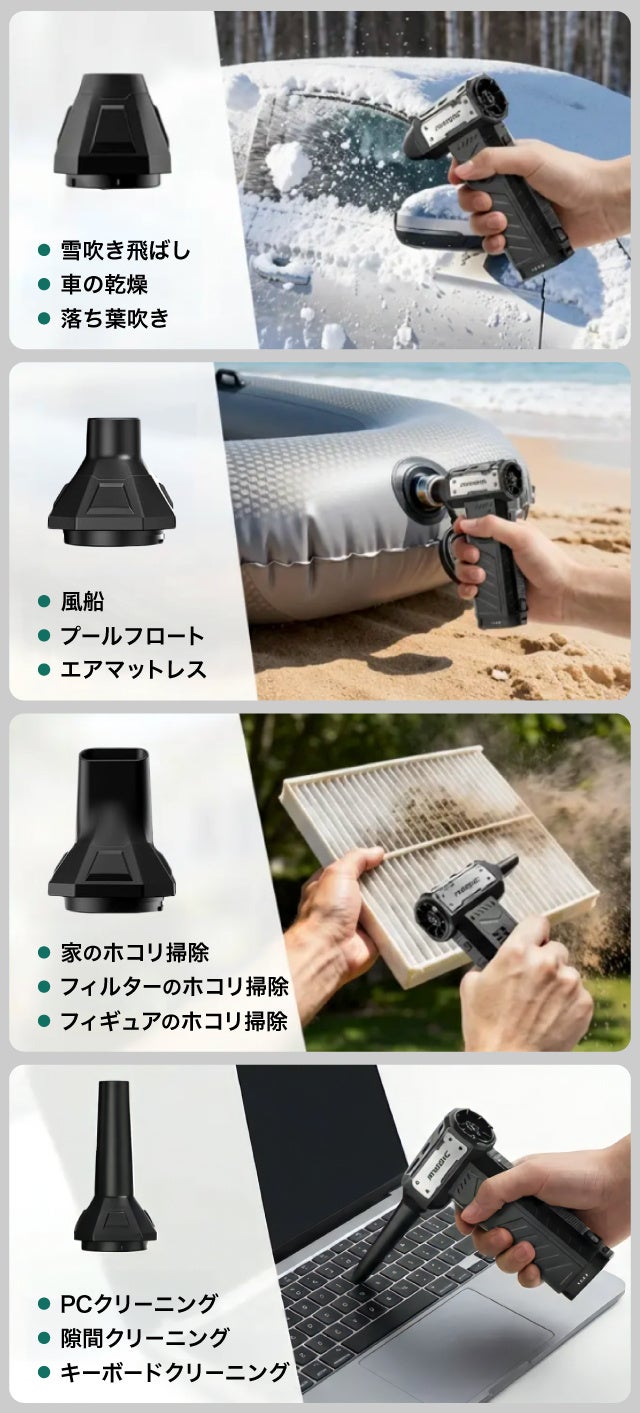 清掃、送風、空気入れなど幅広い用途に対応しています。