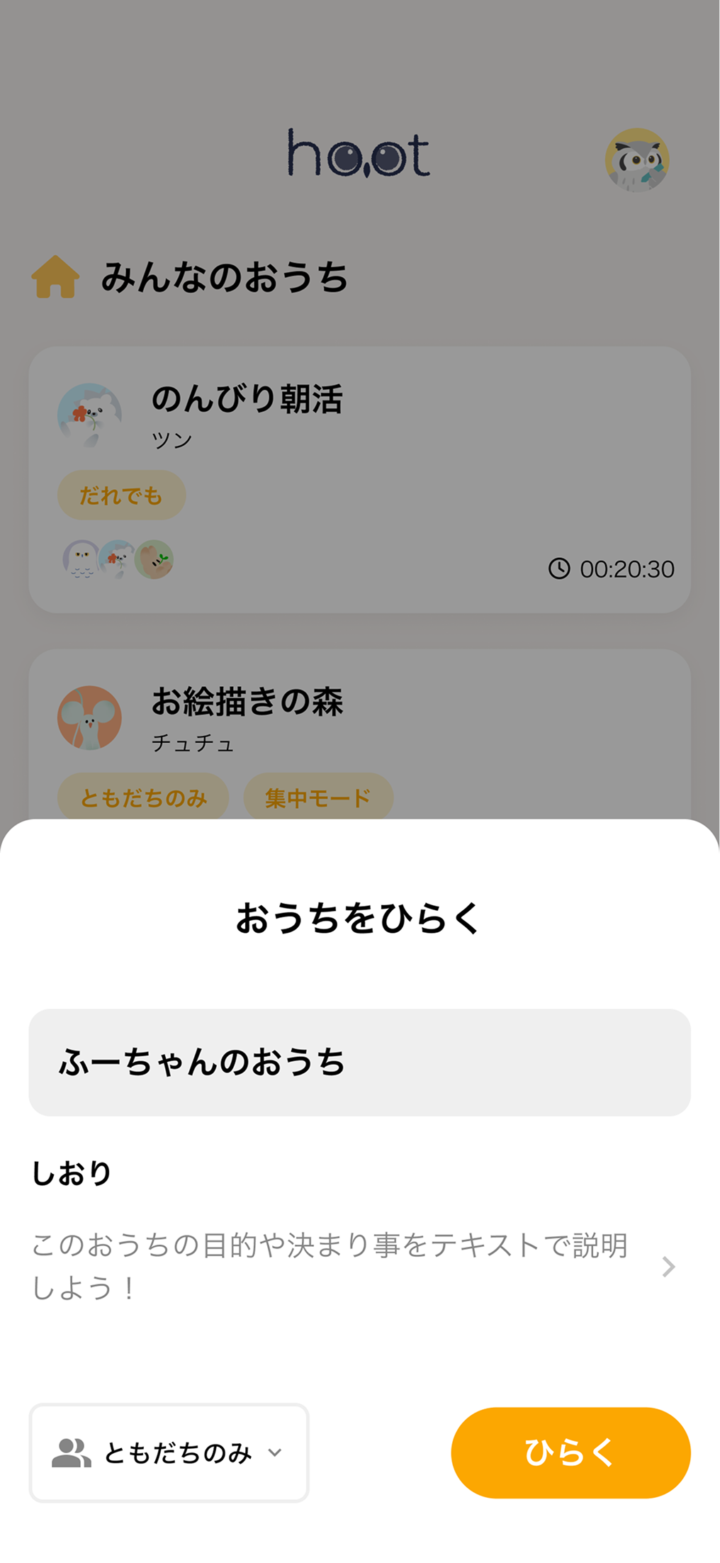 hoot(ふーと)では、ユーザーひとりひとりが自分の「おうち」を持っています。作業をはじめたいときに、好きなタイミングでおうちをひらくだけ。おうちには3つの公開設定があり、用途に合わせて使い分けられます。