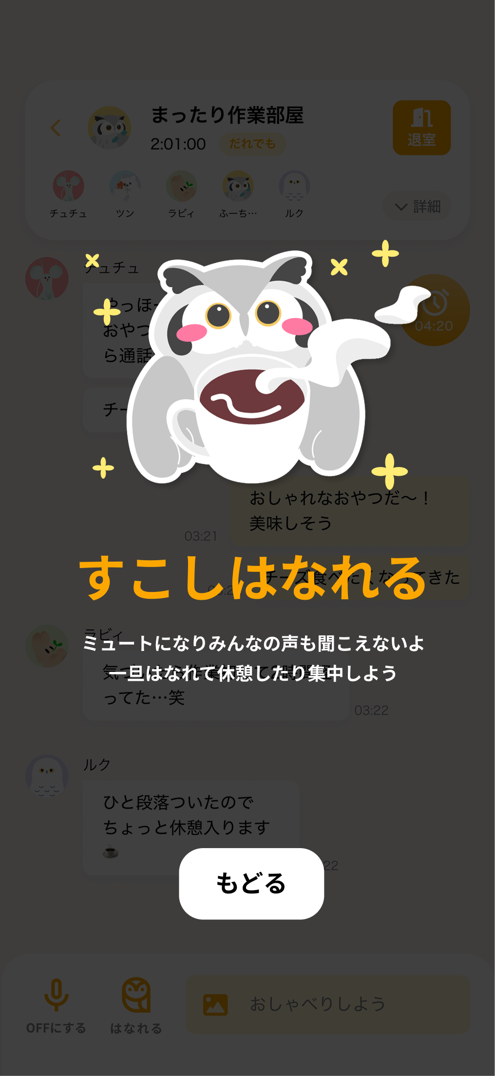 おうちの中で使えるポモドーロタイマーを搭載。参加者全員でタイマーを共有し、誰でも操作できます。作業時間と休憩時間は自由に設定でき、切り替わりのタイミングで効果音が鳴るので、みんなで同じリズムで作業できます。