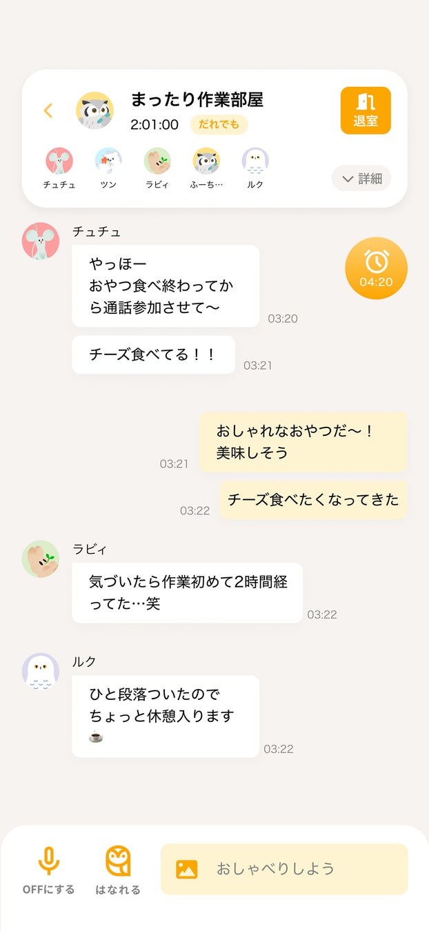 ともだちがおうちをひらくと、通知でおしらせが届きます。アプリを開くと開催中のおうちが表示されるので、そこから参加できます。おうちに入ると、そのまま音声通話がはじまります。1つのおうちには最大12人まで参加でき、少人数での作業はもちろん、みんなで集まる作業会のような使い方もできます。