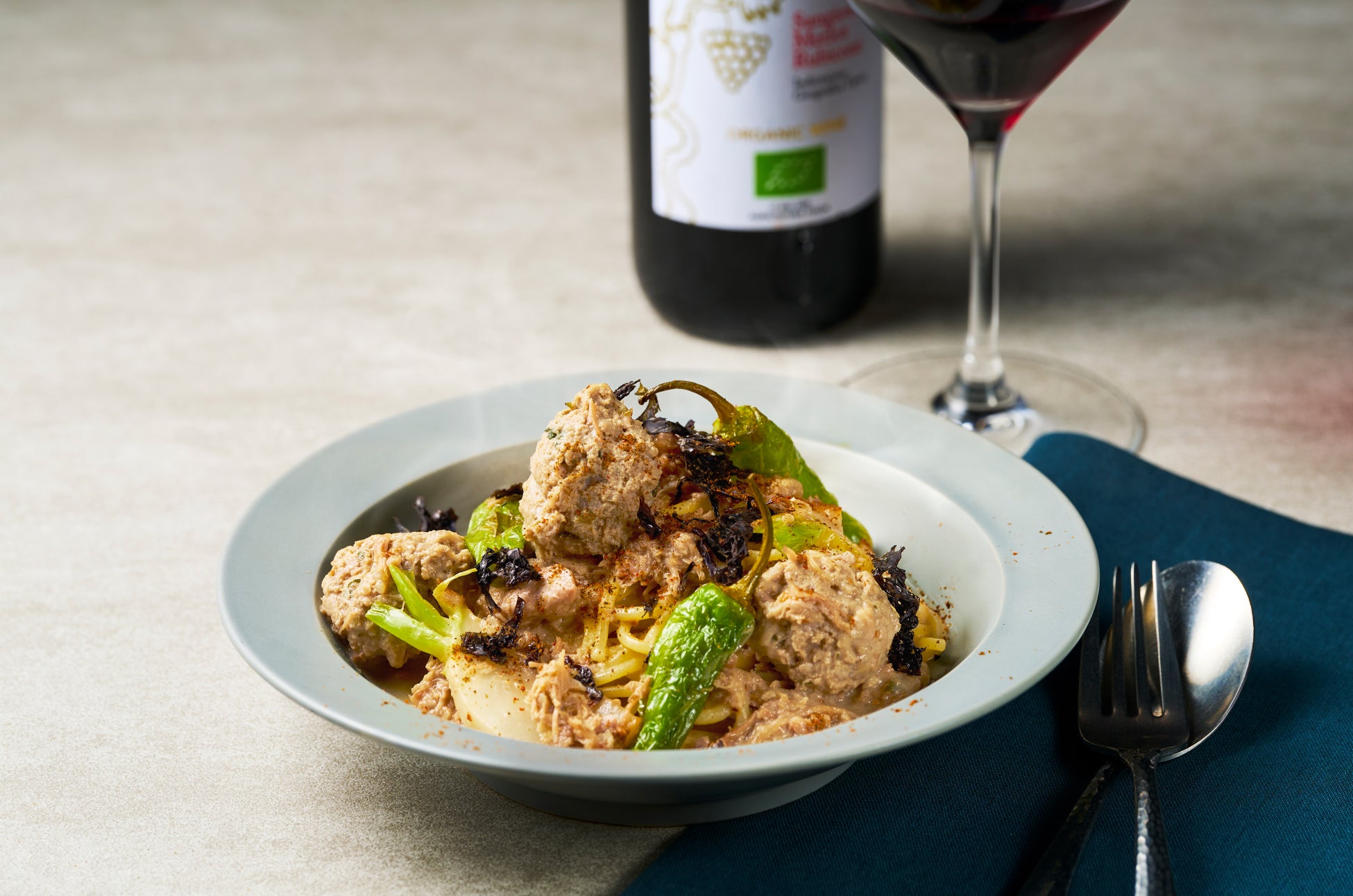 「京鴨と菊芋のパスタ 黒七味添え」をご用意しました。