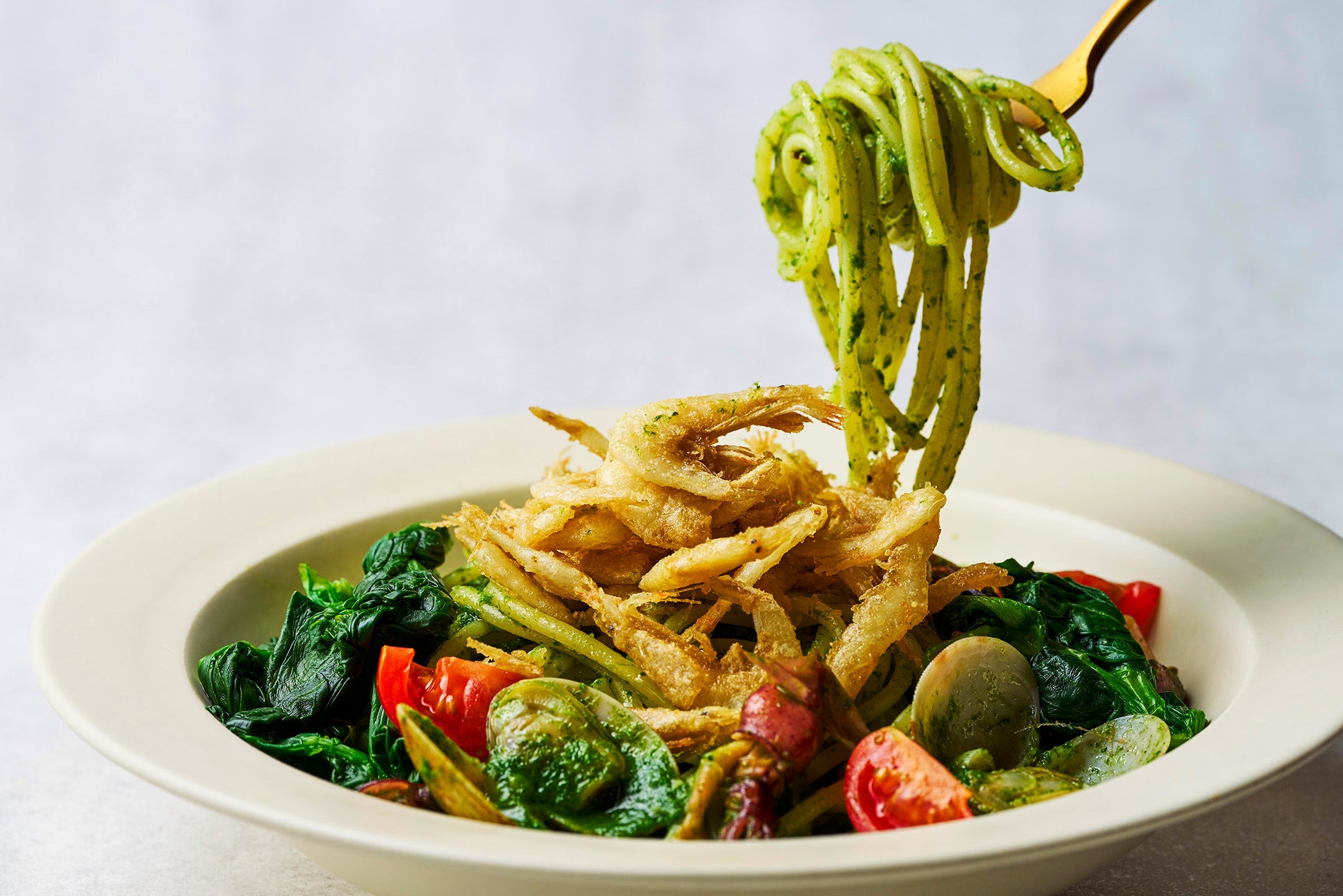 【4月1日〜販売予定】ホタルイカとあさり、菜の花の鯛だし仕立て 白えびのフリット添え[パスタ]