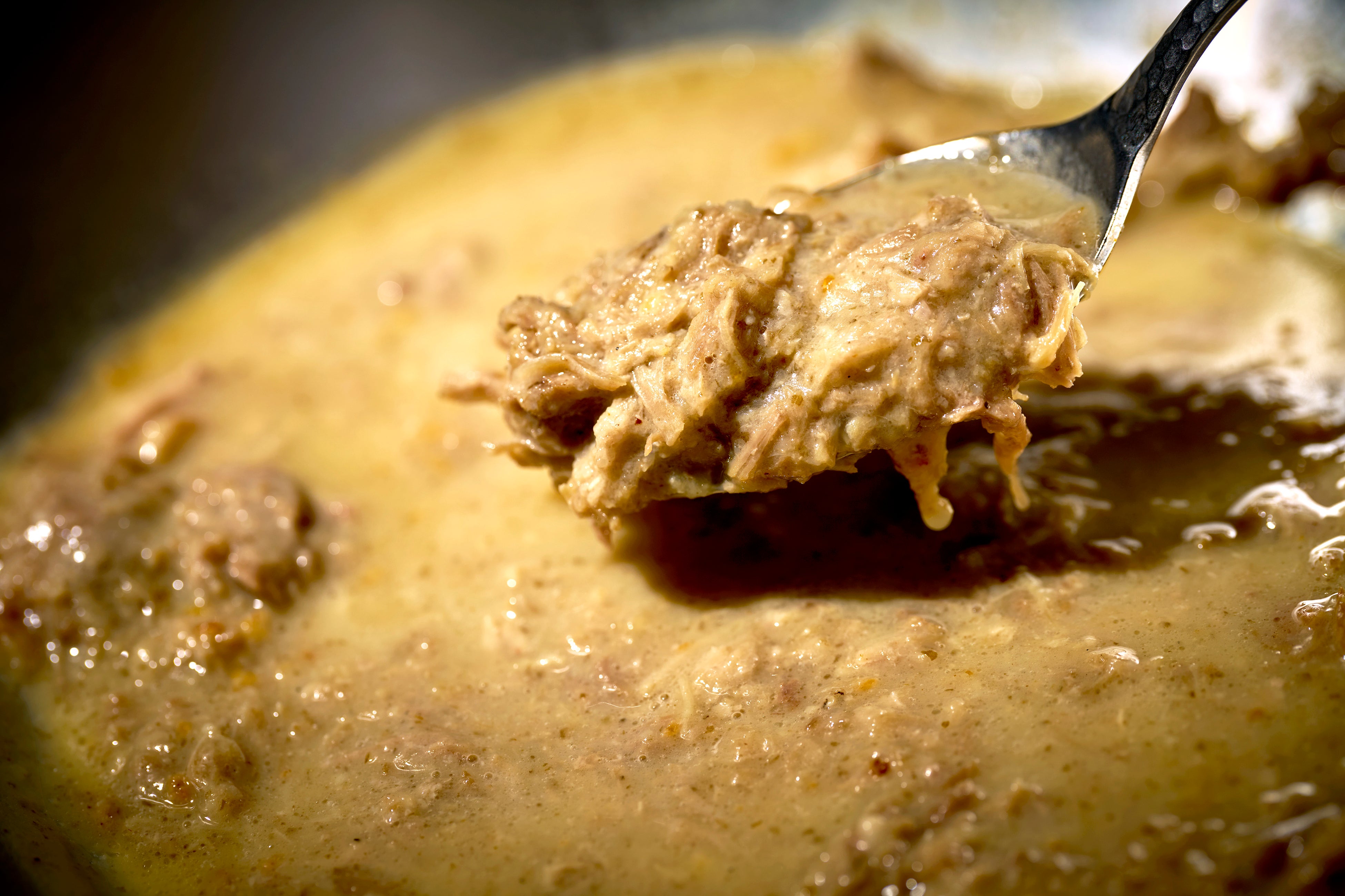京丹波町で育てられた京鴨肉のソテーと菊芋を煮込んだスープに、ペースト状にした菊芋を合わせた、奥行きのあるクリーミーソース。そこへ鴨肉のミンチを加え、仕上げに黒七味をひと振り。
