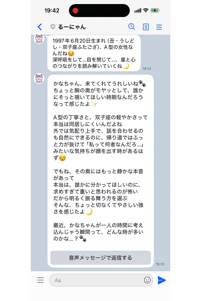 さらに、占いの結果をきっかけに、「この言葉が気になった」「もう少し詳しく知りたい」といった気持ちを、そのままチャットで言葉にすることができます。