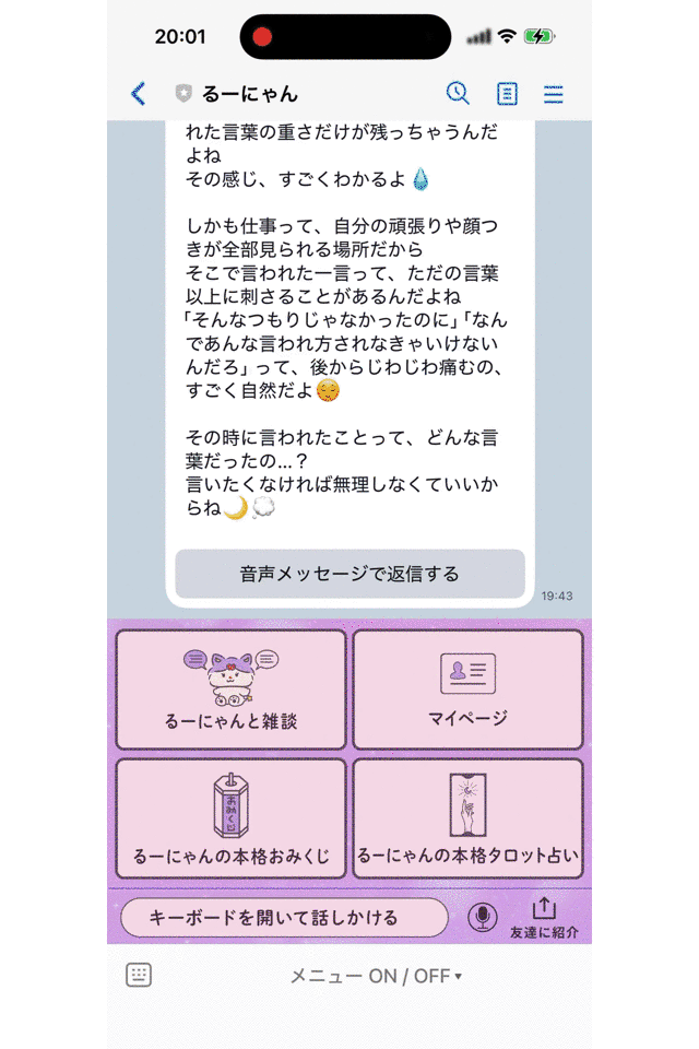 LINE公式アカウントのみで完結する、「チャット」と「占い」の新規サービス「るーにゃん」を提供開始。ユーザーが安心して言葉を預けられるチャット体験に加え、本格的なタロット占いやおみくじ等も展開。