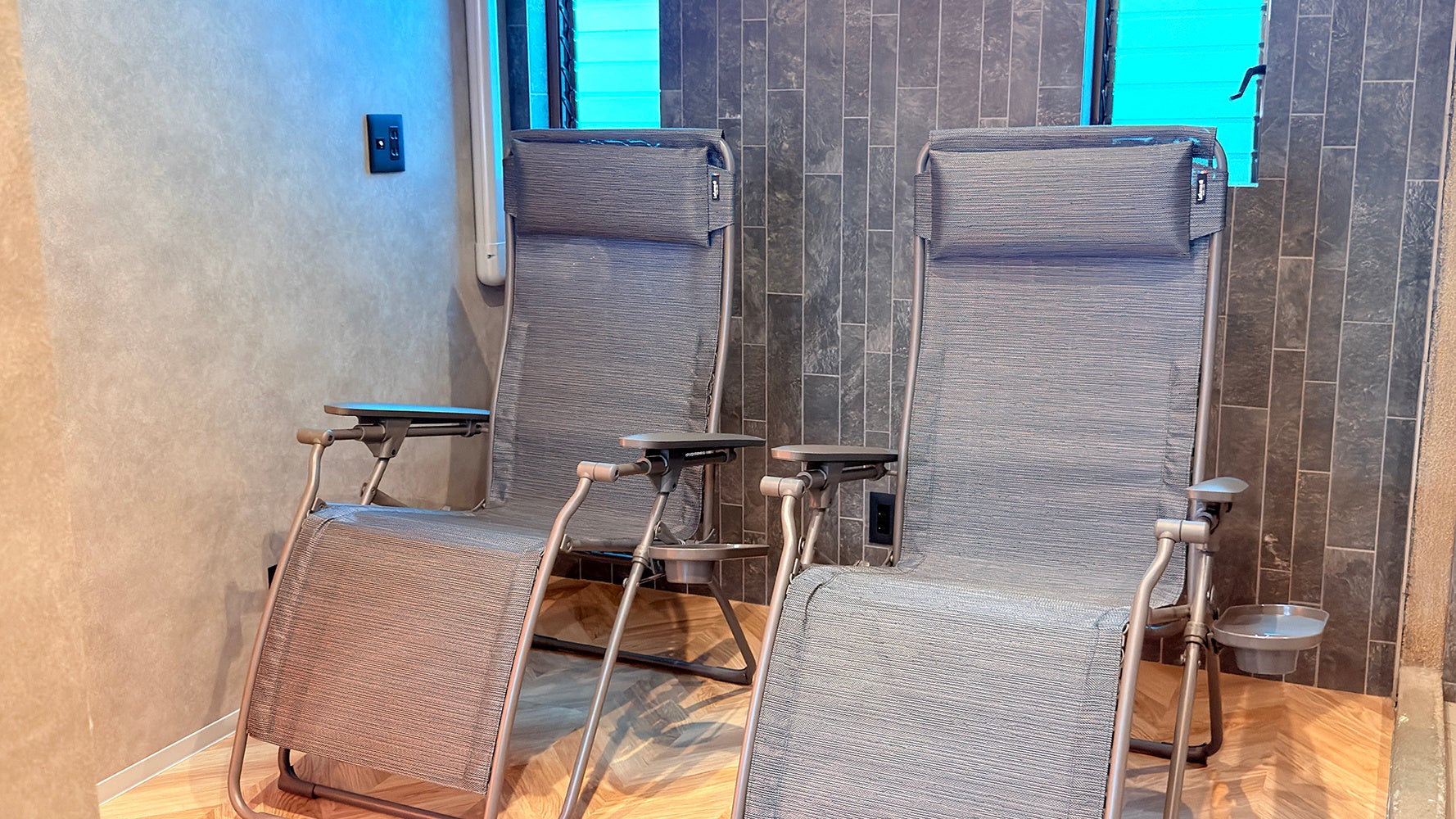 フランスのアウトドア家具ブランドである「 Lafuma Mobilier(ラフマ モビリエ)」のリクライニングチェアを導入しております。「サウナ界のエルメス」と称されることもあり、身体をあずけた瞬間に重力から解放されるような感覚をもたらし、まるで宙に浮いているかのような“ととのい”をご体感いただけます。