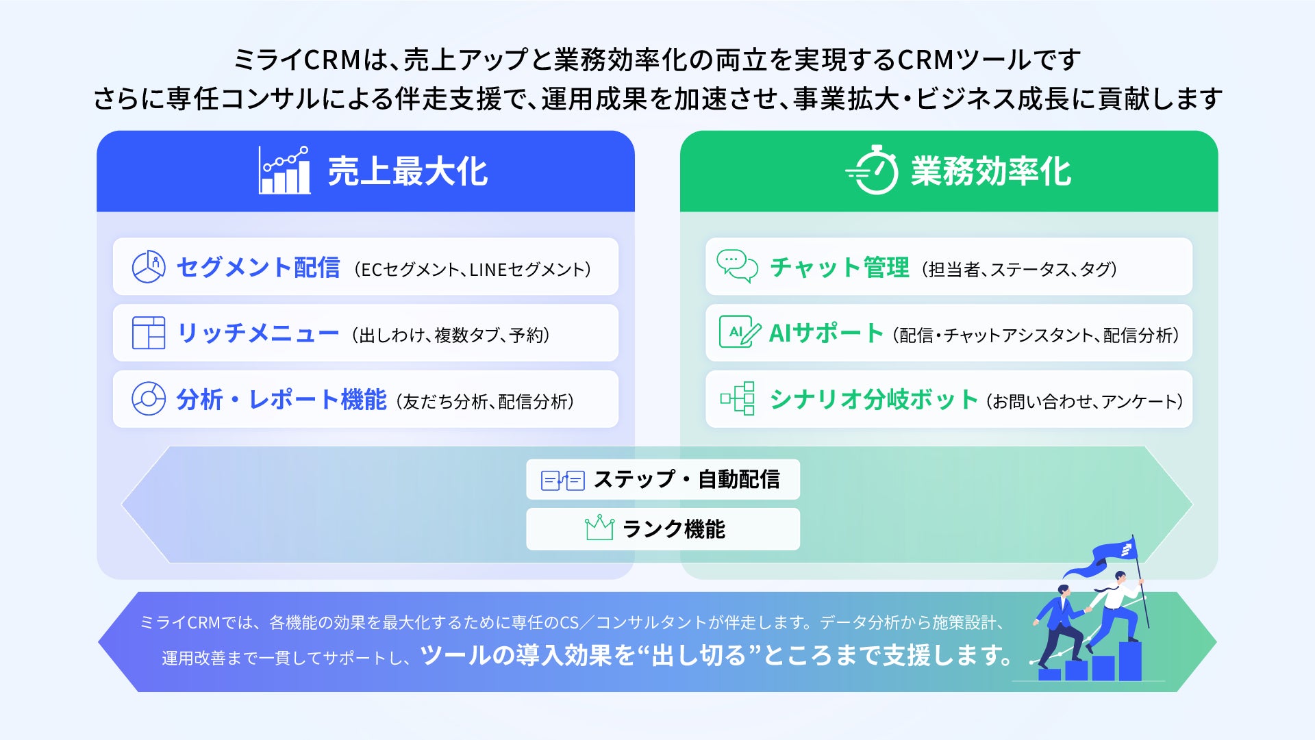 株式会社ミライCRM(本社:東京都渋谷区、代表取締役:高木一樹)は、AIでECの売上成長と業務効率化を同時に実現するLINE CRMツール「ミライCRM」を正式リリースしたことをお知らせいたします。