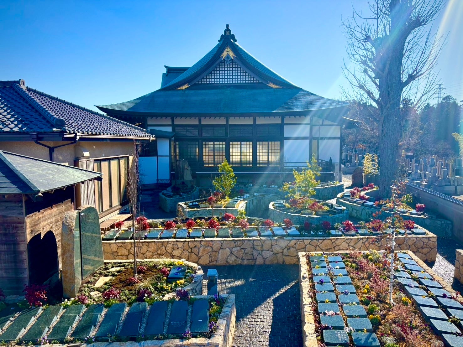 墓域は和モダン庭園スタイル。敷地内に駐車場・会館を併設し、葬儀・法要・相談・お参りを
