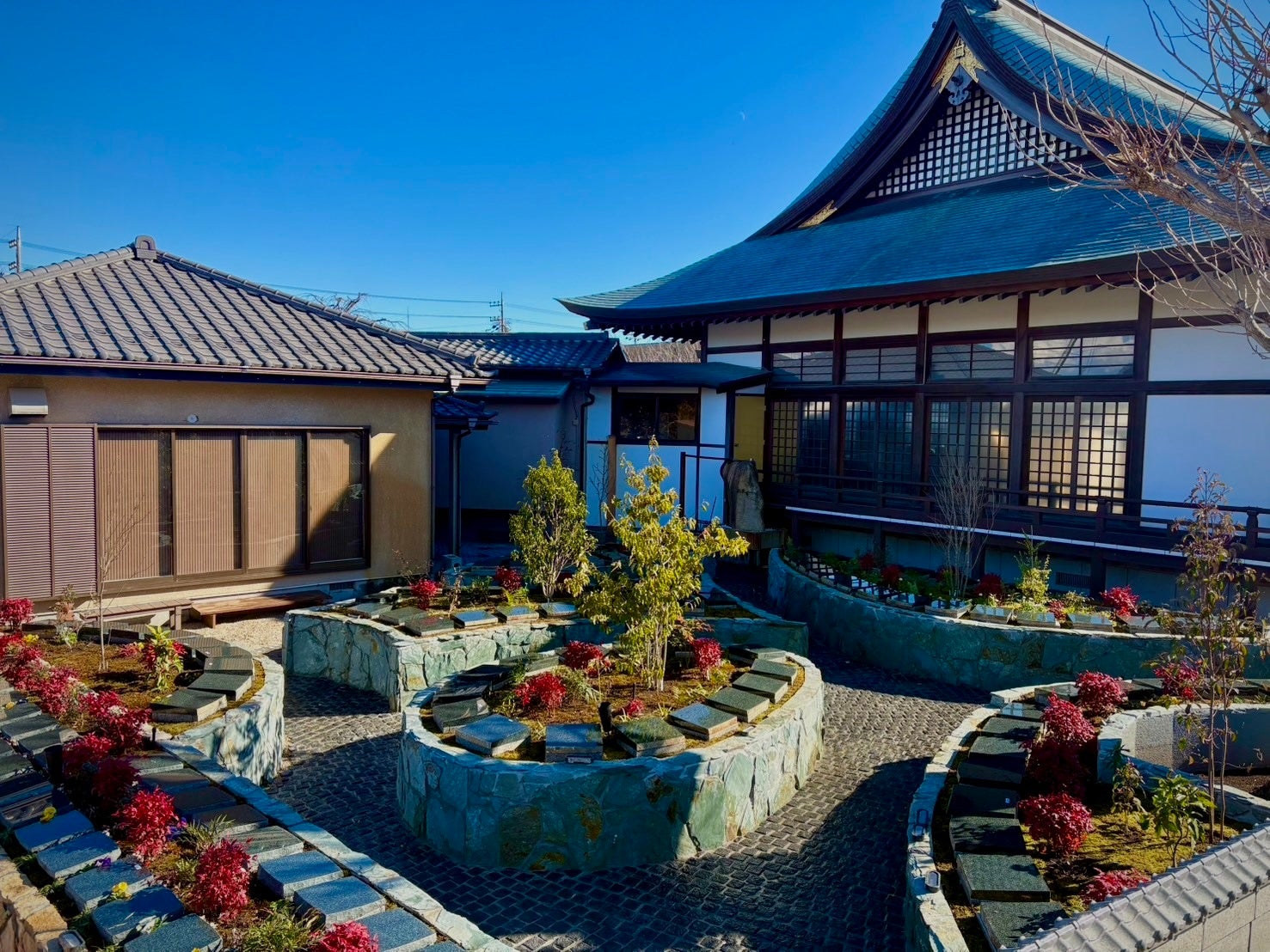 3. 駐車場・会館付きの和モダン庭園。車移動世代でも通いやすいです。