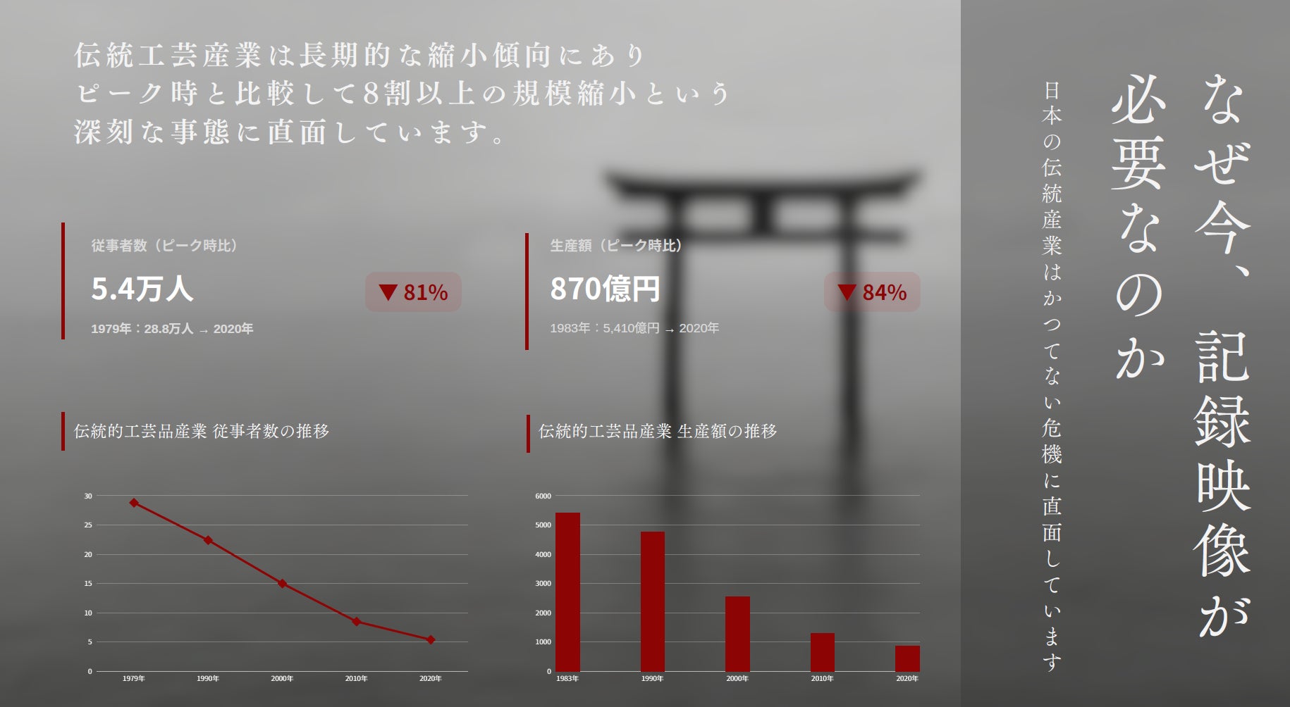これまで当チャンネルでは、日本各地の秘境や観光地をキャストと共に紹介してまいりました。しかし、取材を通じて地域の深層にある「人」や「技術」の魅力に触れる中で、日本の伝統産業が抱える深刻な課題に直面しました。 伝統工芸産業の従事者数はピーク時の約5分の1(1979年比81%減)、生産額も約8割減と長期的な縮小傾向にあります。一方で、訪日外国人旅行者数は過去最高レベルに達し、日本の独自文化への関心はかつてないほど高まっています。