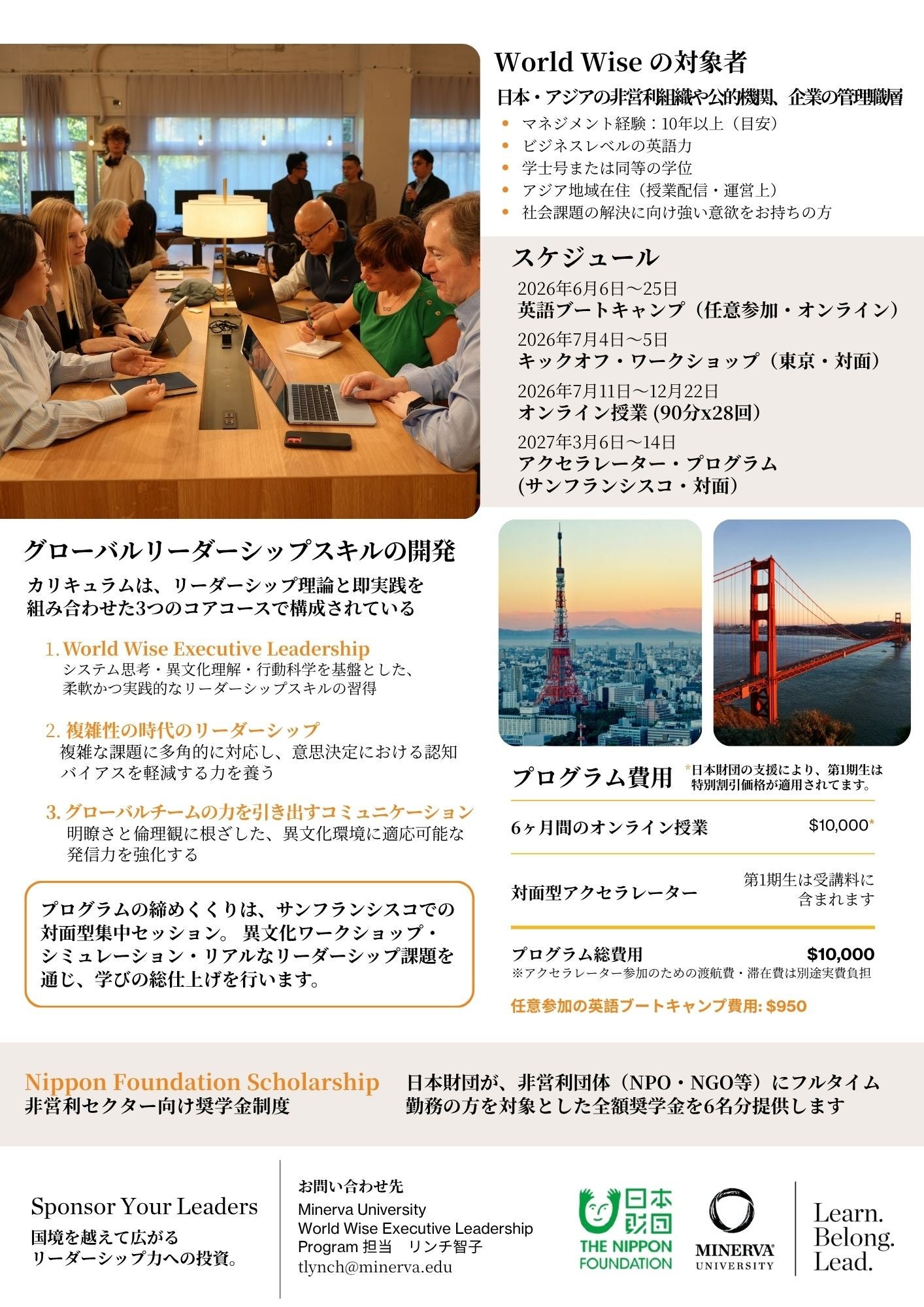 ミネルバ大学(米国・サンフランシスコ)は、日本財団のご支援のもと展開するグローバルリーダー育成プログラム「World Wise Executive Leadership Program」において、NPO/NGOなど非営利セクターの方々を対象に、受講費を全額負担する奨学金を6名分提供します。