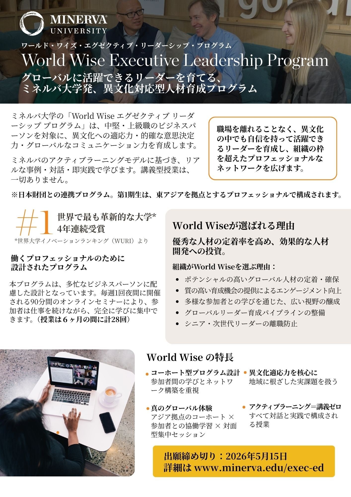 本説明会では、ミネルバ大学による「World Wise Executive Leadership Program」の概要をはじめ、プログラム内容、カリキュラム、応募方法等についてご案内します。また、参加をご検討中の方からのご質問にもお答えする予定です。