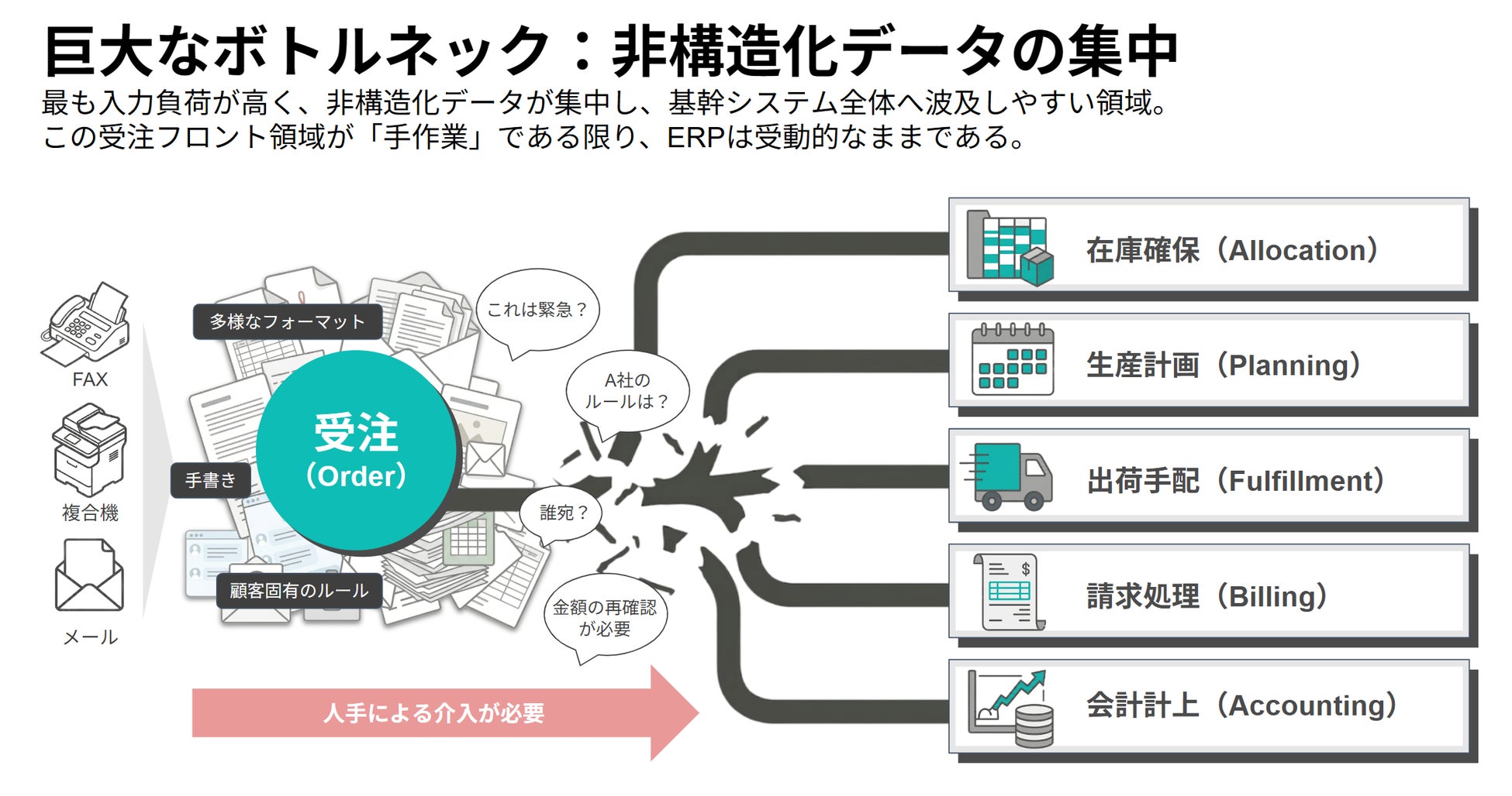 一方で、この受注領域には大きな構造的課題が存在します。注文情報は、依然としてFAX・メール・手書き書類など多様なフォーマットでやり取りされており、その内容は非構造化データとして人間による読み取り・判断・入力に依存しています。