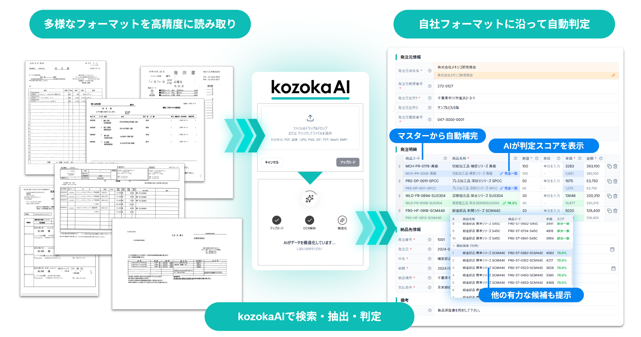 当社の「kozokaAI 受注AI-OCR」は、この業務理解エンジンを実装したソリューションであり、読み取りや抽出にとどまる従来のAI-OCR製品とは異なり、業務の判断と実行までを担う点で一線を画しています。