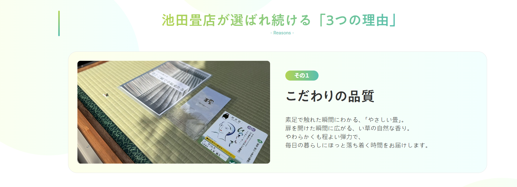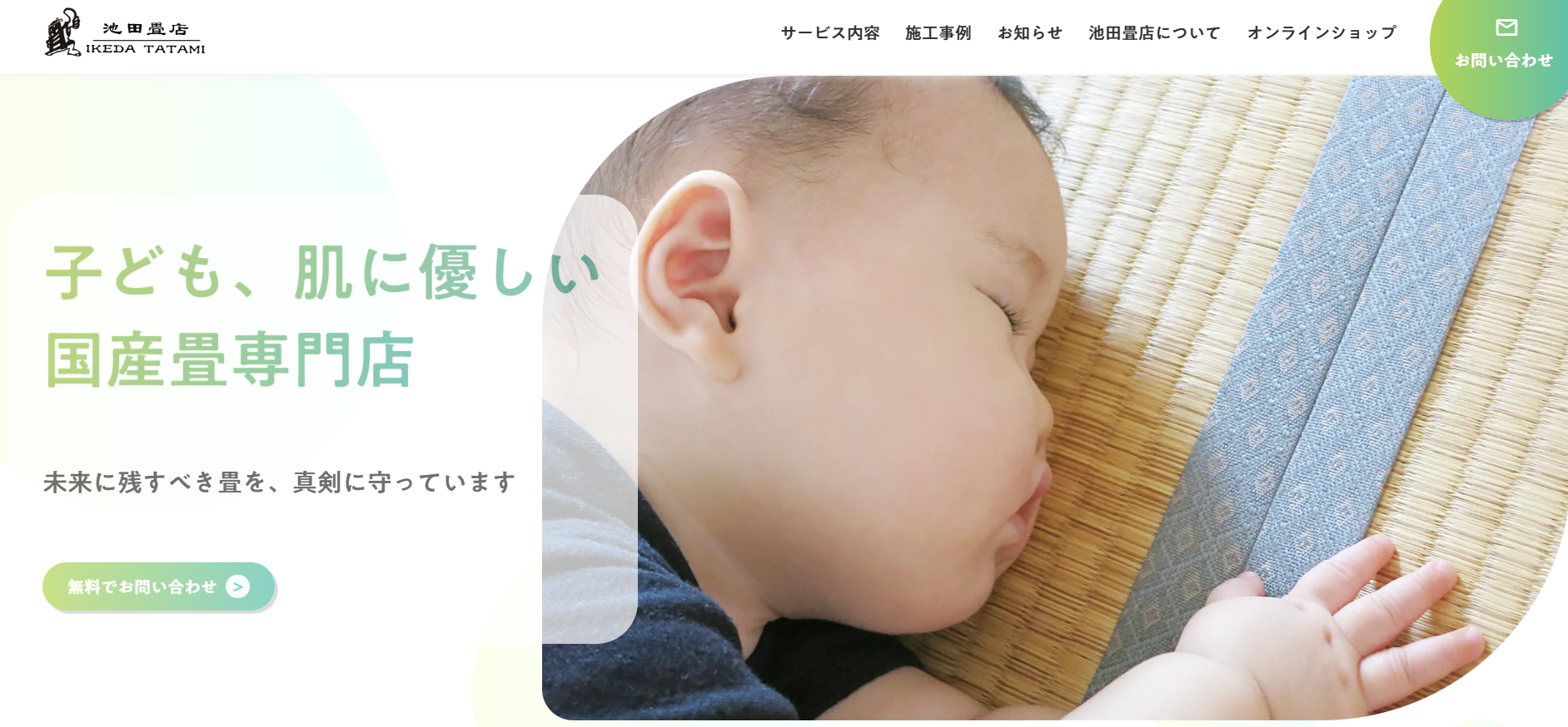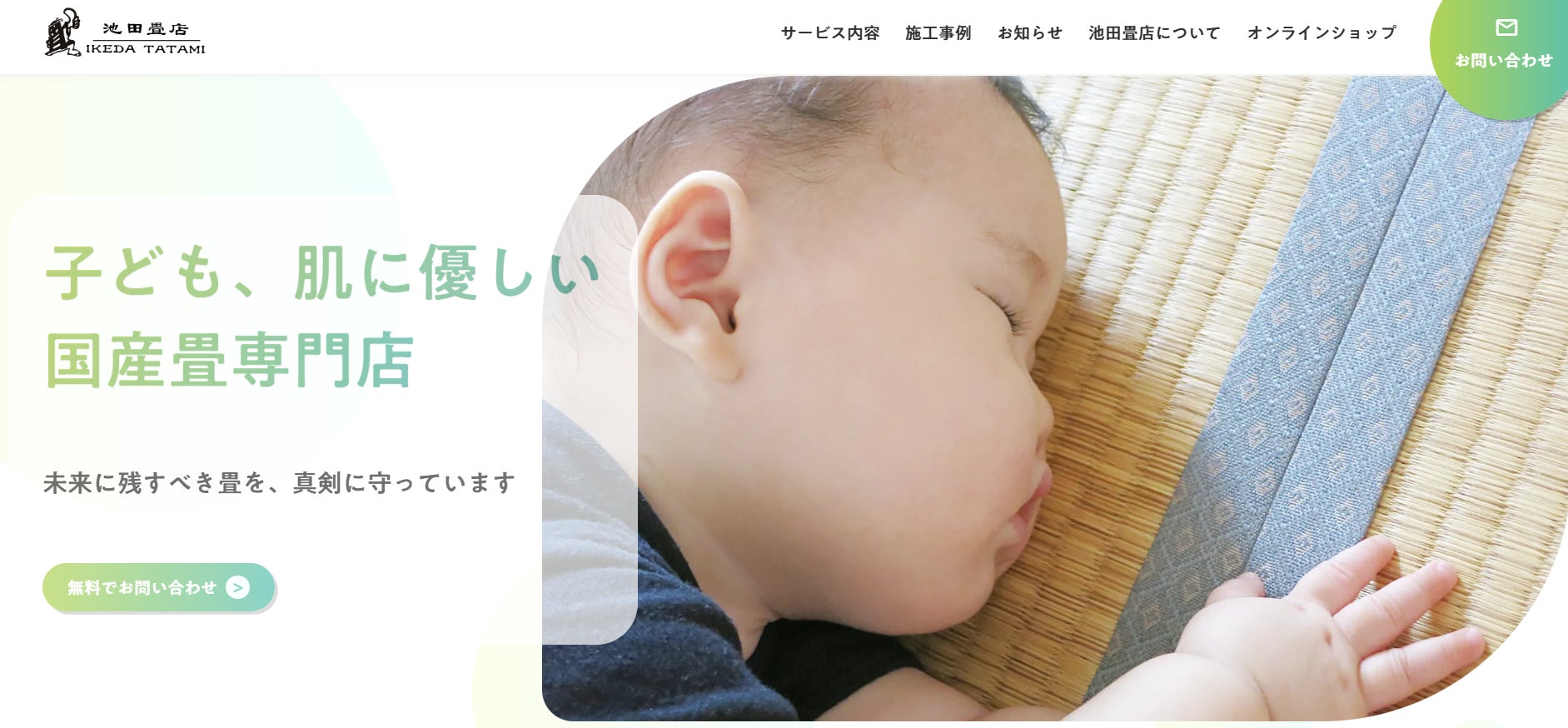 当店では、小さなお子様や肌が弱い方でも肌荒れが起きにくい、国産畳を専門に取り扱っています。「日本に古くから伝わる畳の文化を後世に残していきたい」という想いと、そのための取り組みが伝わりやすいファーストビューに刷新しました。