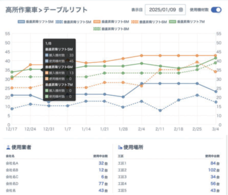 機材の搬入状況や利用傾向を可視化。不要な機材の早期返却や、余分な発注の抑制につなげ、現場の利益向上に貢献。