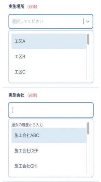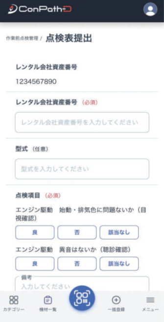 また、各社在庫管理用のQRコードもしくは資産管理番号から該当する点検表を特定でき、QRコードを発行して貼付ける手間も不要となります。スマホだけで月例点検や作業前点検の記入・提出を完結することが可能です。