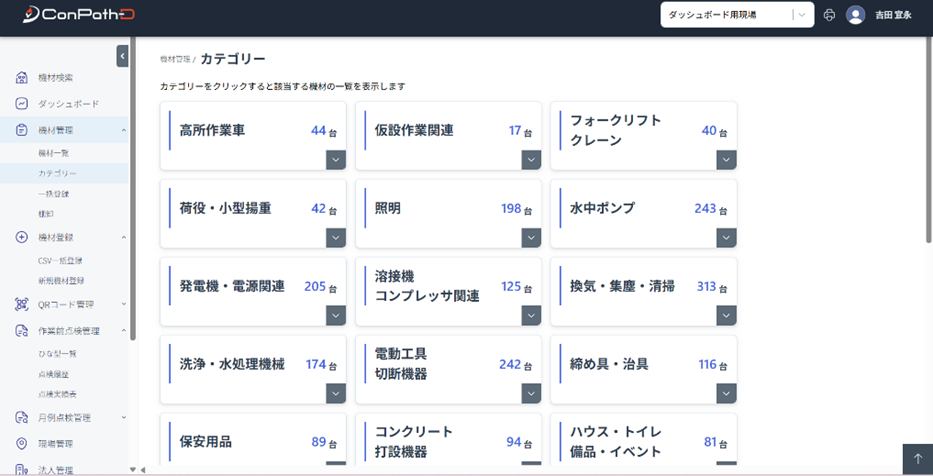 カテゴリー、名称、会社、使用者別で台数を表示できます。その他仮設品、自社機械もデータ反