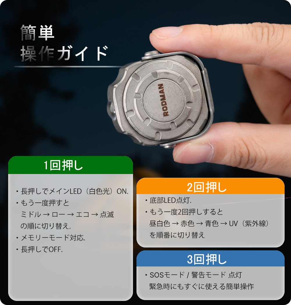 本体にはボタンが1つだけ。長押しでメインライト、ダブルクリックで底部ライト、トリプルクリックでSOSや警告モードを点灯できます。
