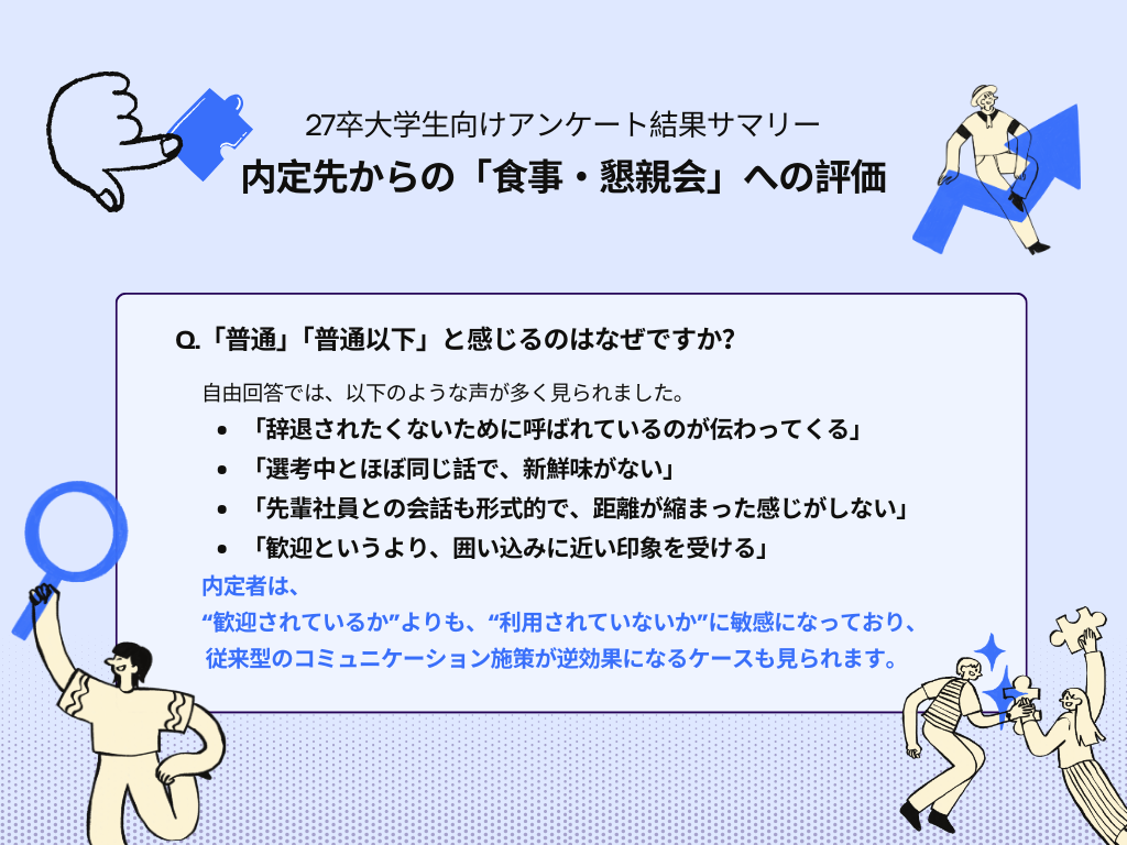 GoldenMessage株式会社(本社:東京都渋谷区、代表取締役:浜岡 竜雅)が実施した「27卒大学生向けアンケート調査」により、企業が良かれと思って実施している従来の食事会や懇親会が、内定者にとって必ずしもポジティブに受け取られていない現状が浮き彫りになりました。