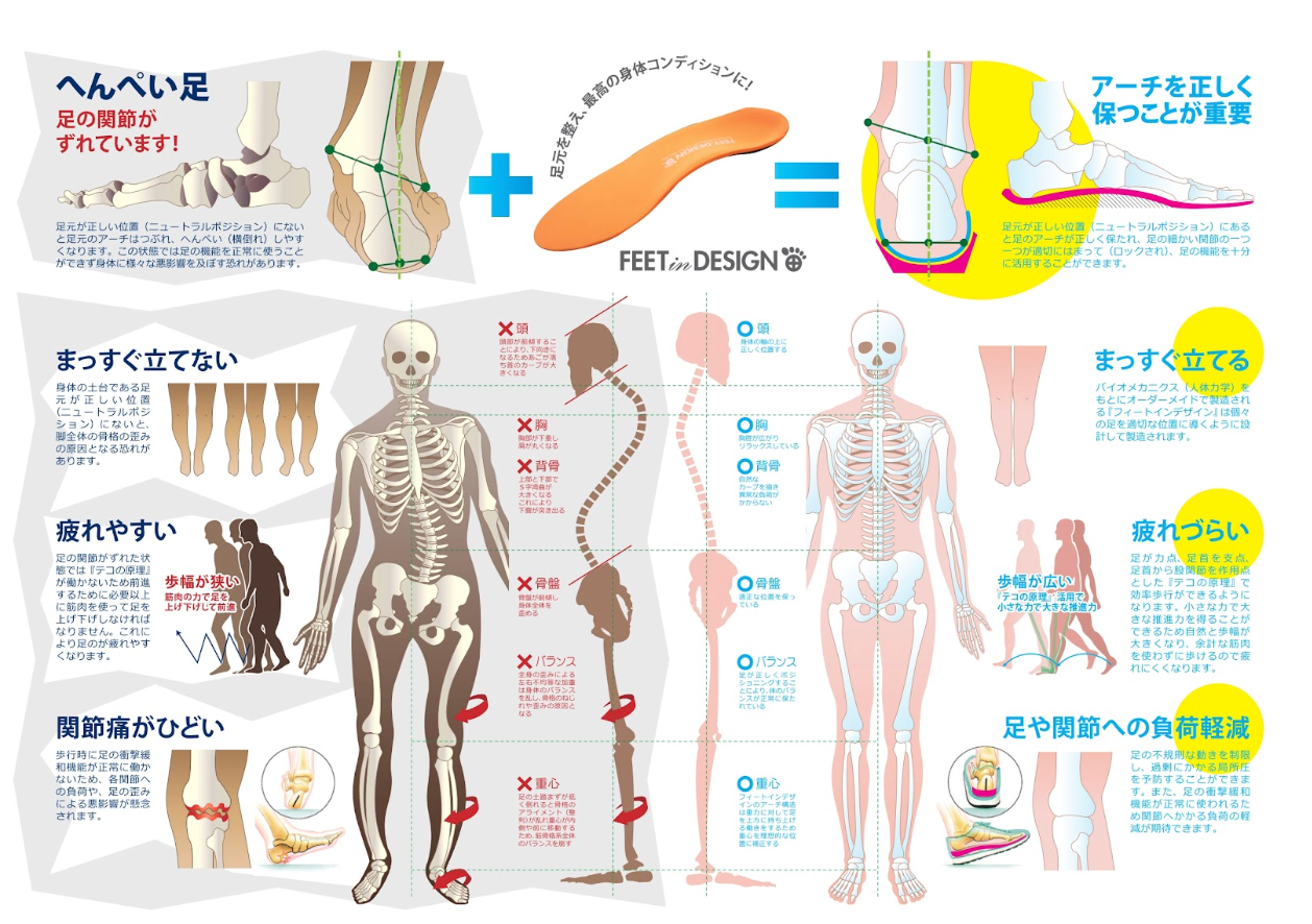 今回導入するフィートインデザインのオーソティクスは、医療的知見に基づく評価と設計により、足部を適切なポジションへ導き、身体全体のバランス改善をサポートします。