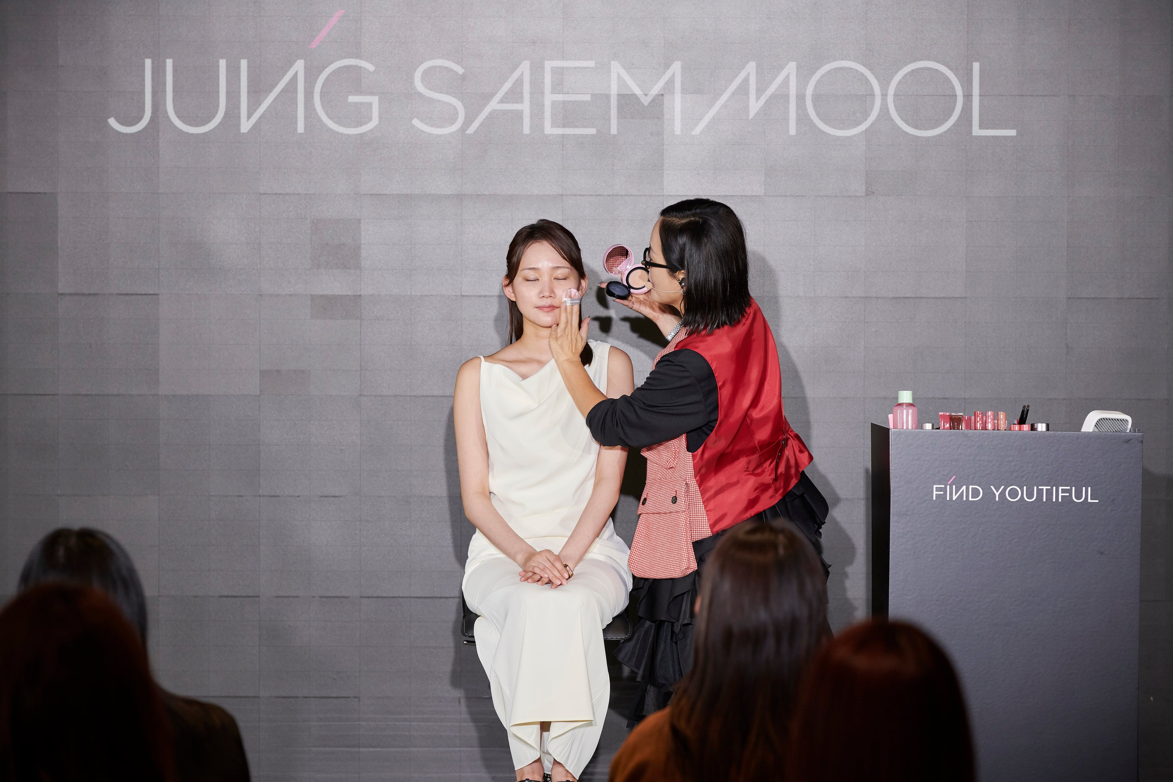 さらにメイクアップの中盤では、壇上から降りて席を回りながら参加者に製品を使ったメイクアップを披露したり、ステージ上に参加者を呼んでメイクアップを実演するなど、ジョンセンムル先生らしいユーモアたっぷりのビューティークラスに、会場からはたびたび感嘆の声が上がりました。