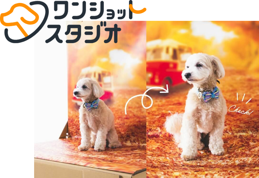 飼い主自身が操作しながら撮れるので、愛犬の自然な表情を引き出すことができ、独自のAIで、ペットの輪郭を切り取り、背景との合成写真が瞬時に出来上がります。
