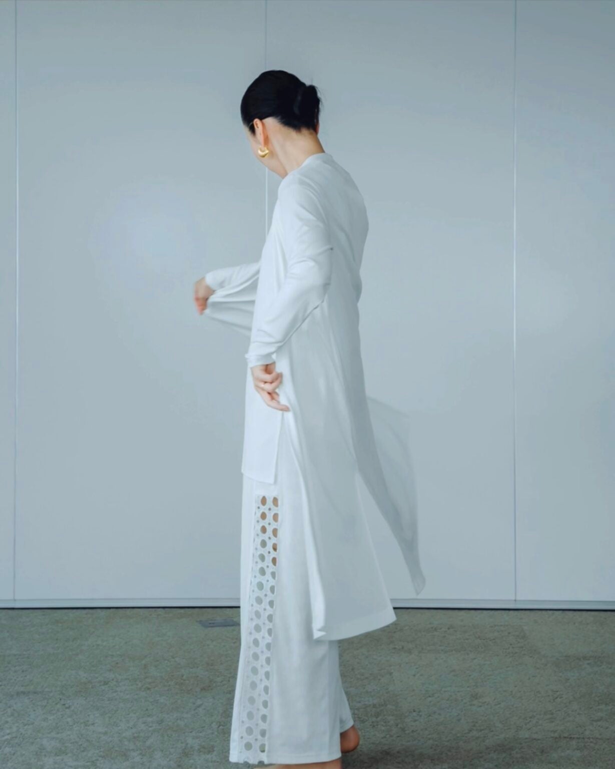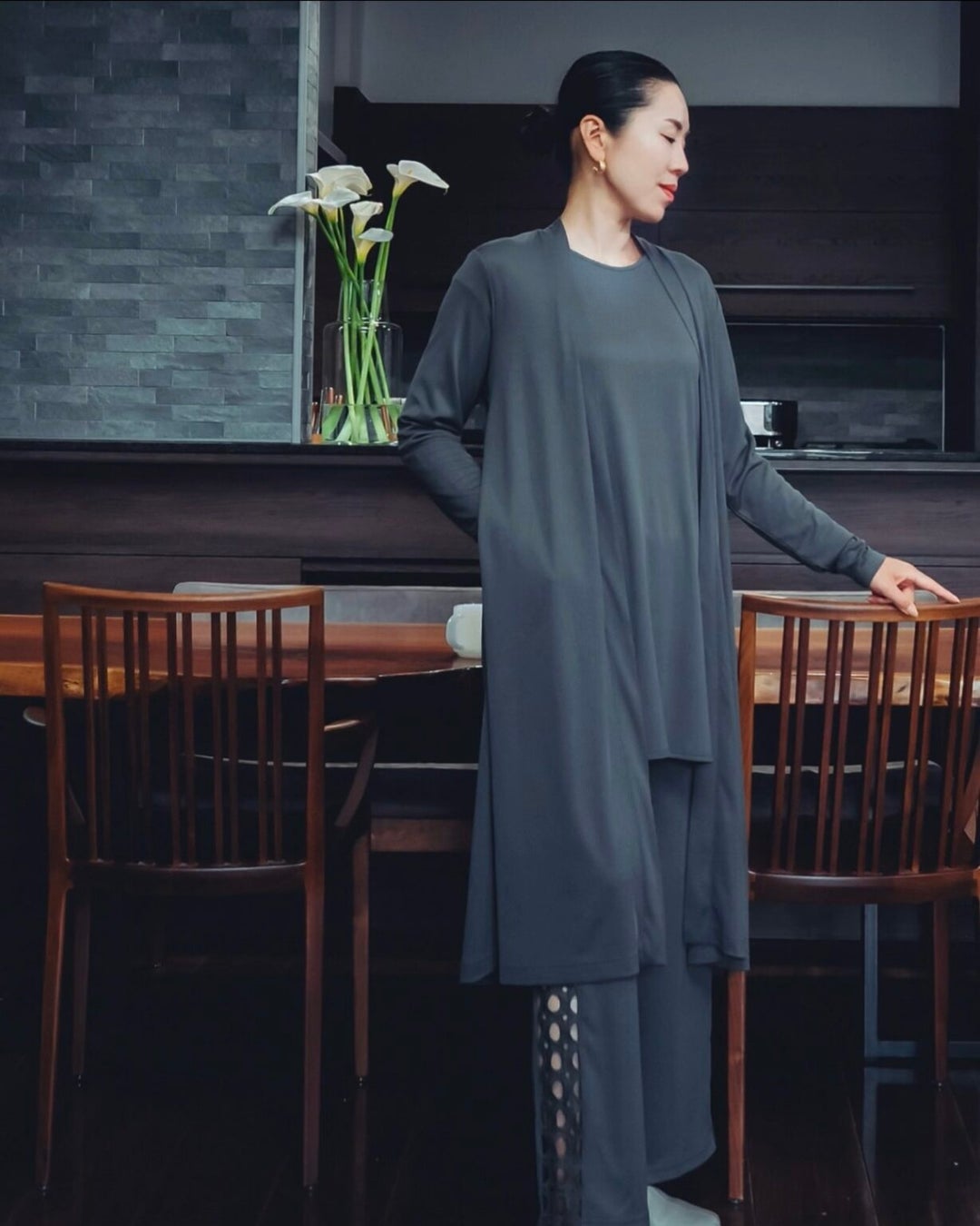 家の中だけでなく、そのまま外出できる美しさを追求したデザイン。パンツ部分のサイドにあしらったディテールがさりげないアクセントとなり、日常の装いに華やかさをプラスします。「ルームウェア」でありながらも、外出時にも違和感なく着用できる洗練された佇まいを実現しました。