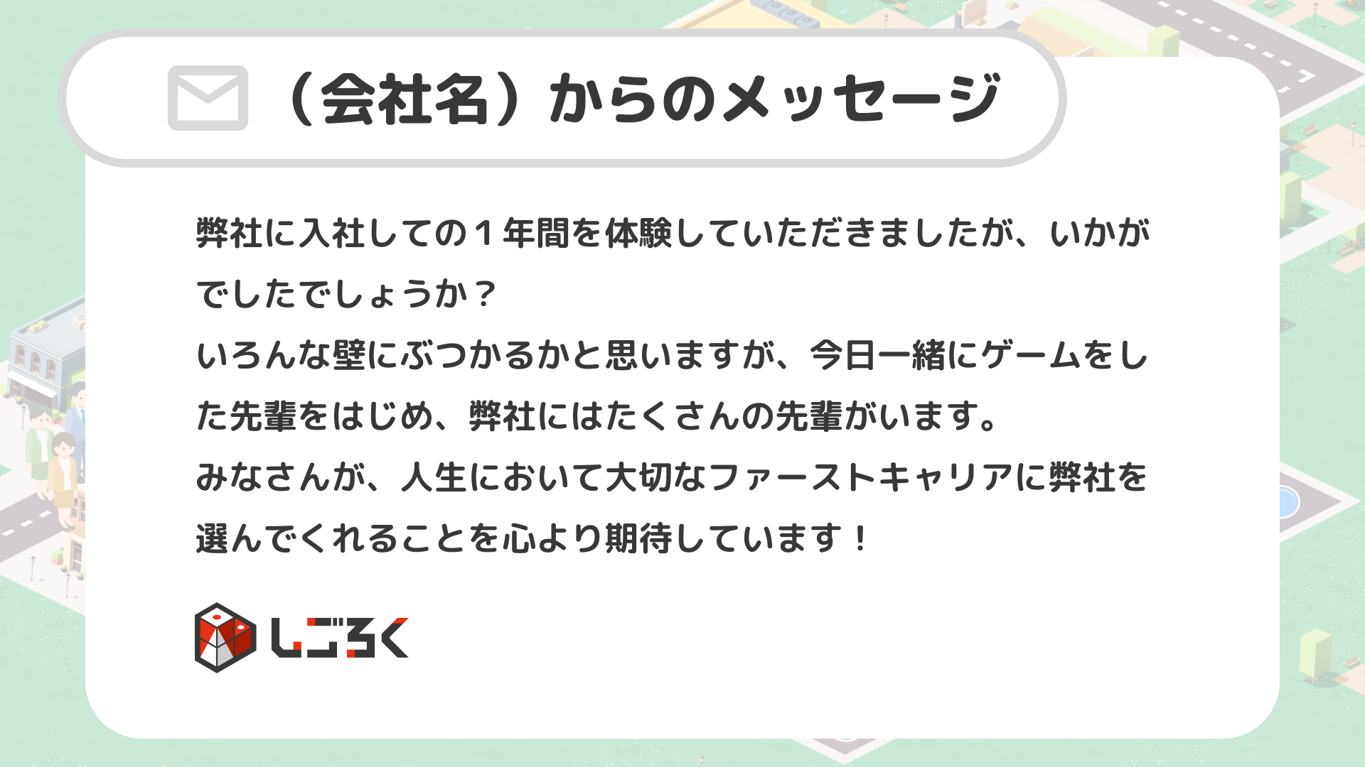 この答え合わせの場で、「なぜその判断が望ましいのか」を企業側の視点で共有することで、貴社が大切にしている価値観や職場の雰囲気を、具体的な“体験”として伝えられます。