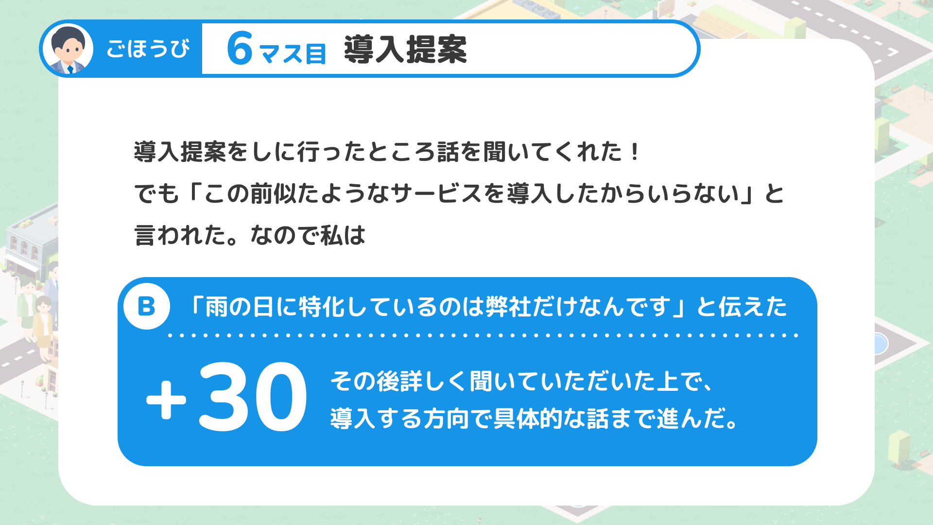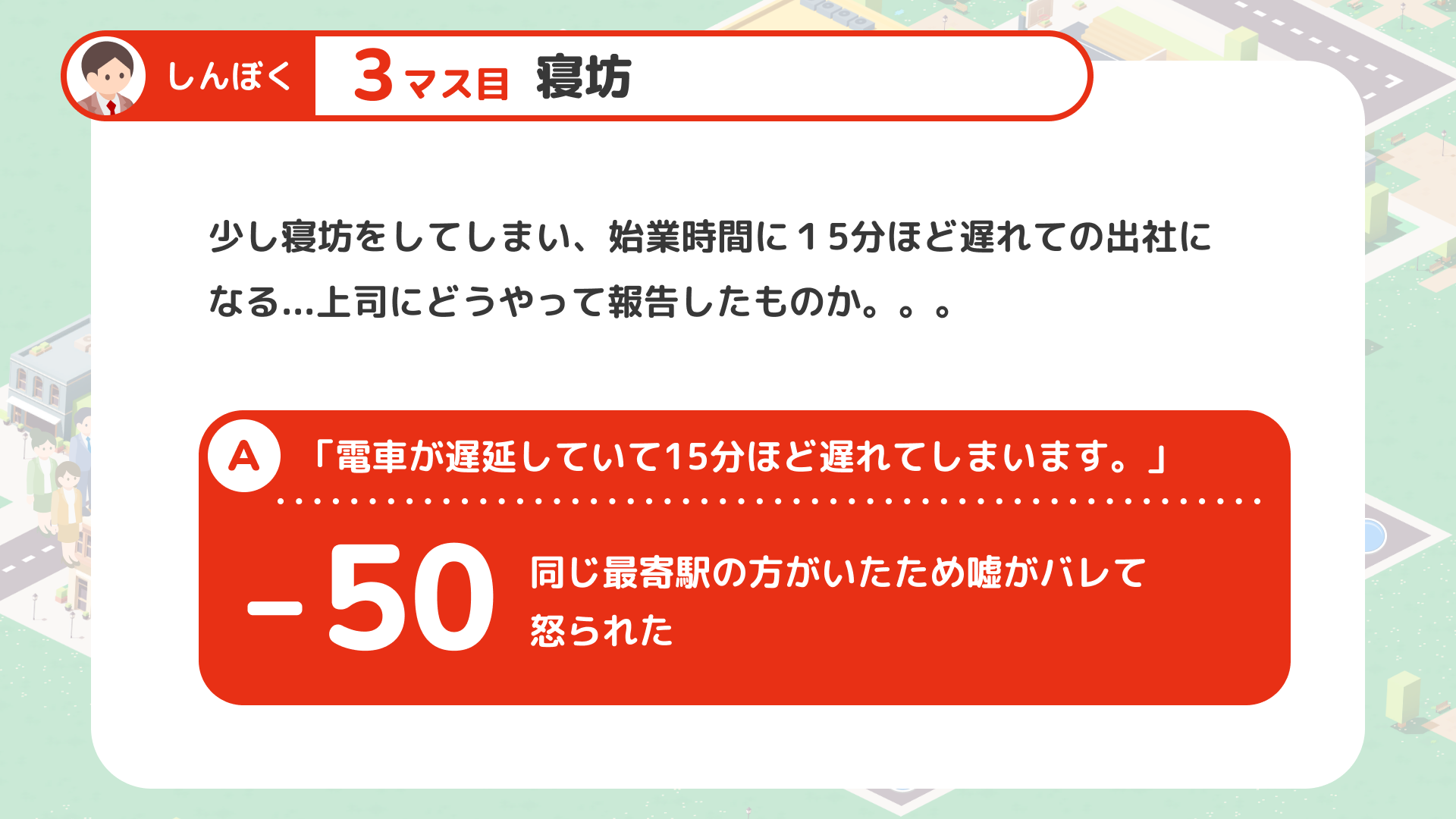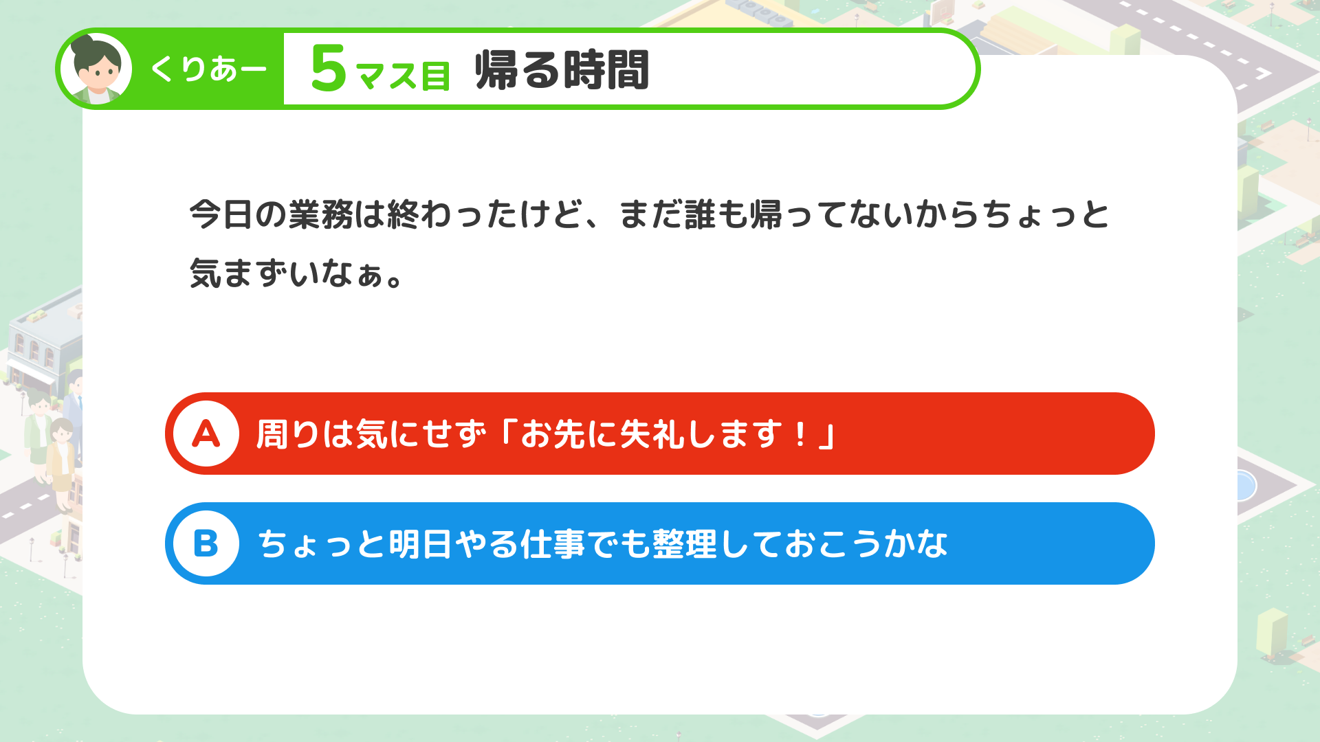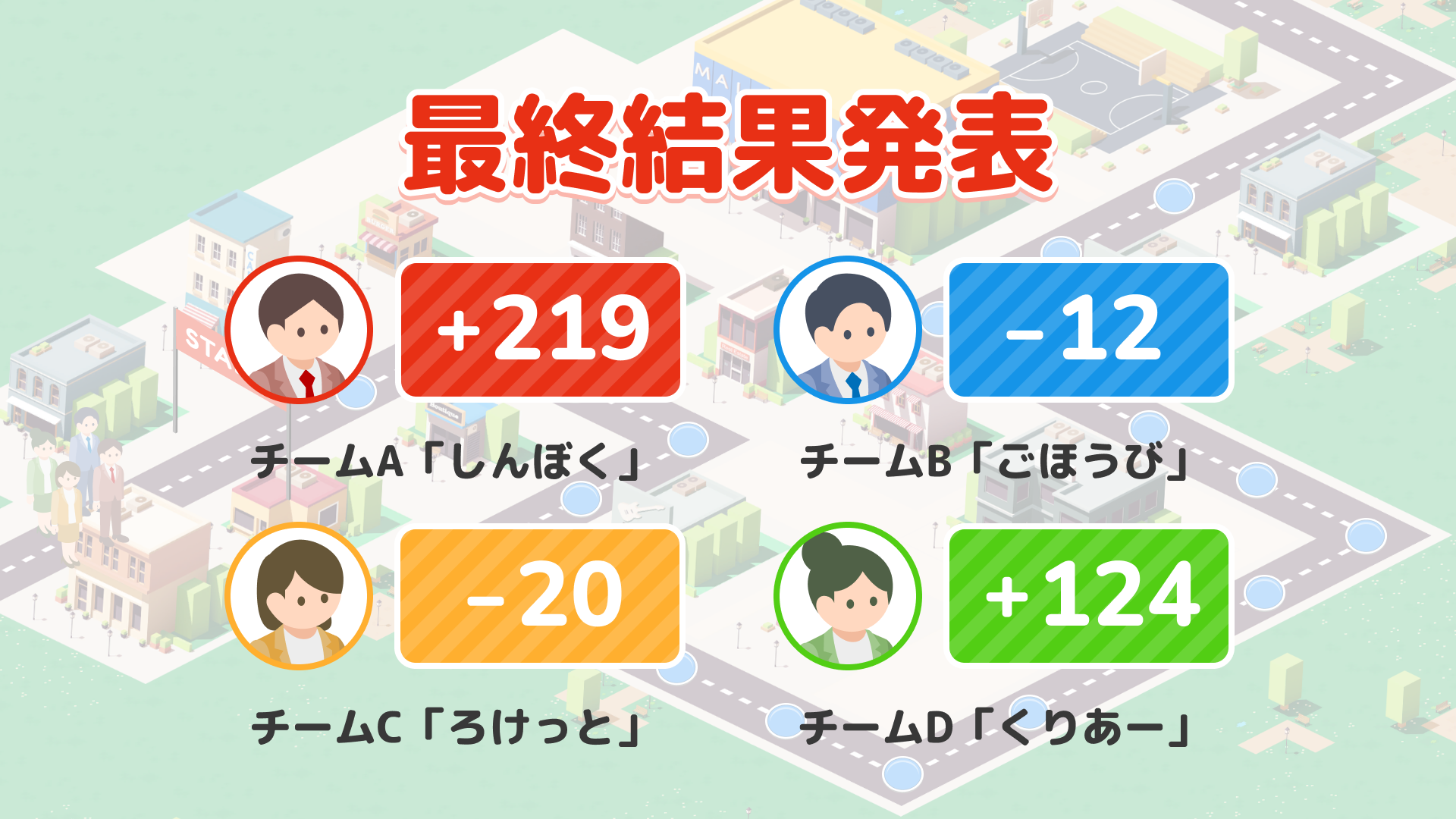 最大20名が4チームでプレイし、日々の判断シーンを「状況・選択肢・結果」としてマス化、チームで議論しながら意思決定を疑似体験できます。