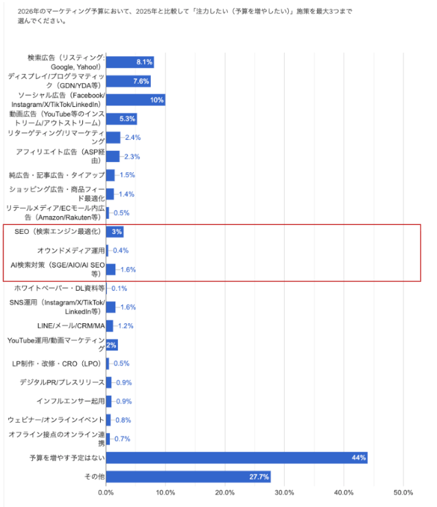 2026年の新潮流「自然検索への投資」:注力施策として「SEO」と「AI検索対策」の合算値(4.6%)が、動画広告(5.3%)やディスプレイ広告(7.6%)に次ぐ関心領域へ浮上。