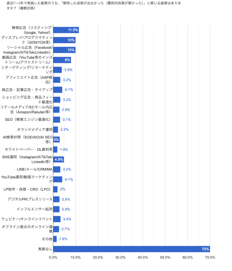 失敗施策のワースト1位は「検索広告」:費用対効果が悪かった施策として18.5%が回答。「ソーシャル広告(16.7%)」を上回り最多。