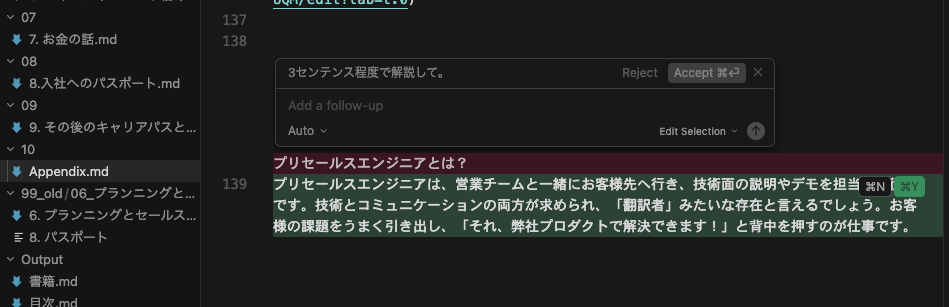 CursorとClaudeを組み合わせた執筆環境。選択したテキストに対してAIが文章を生成・補完する