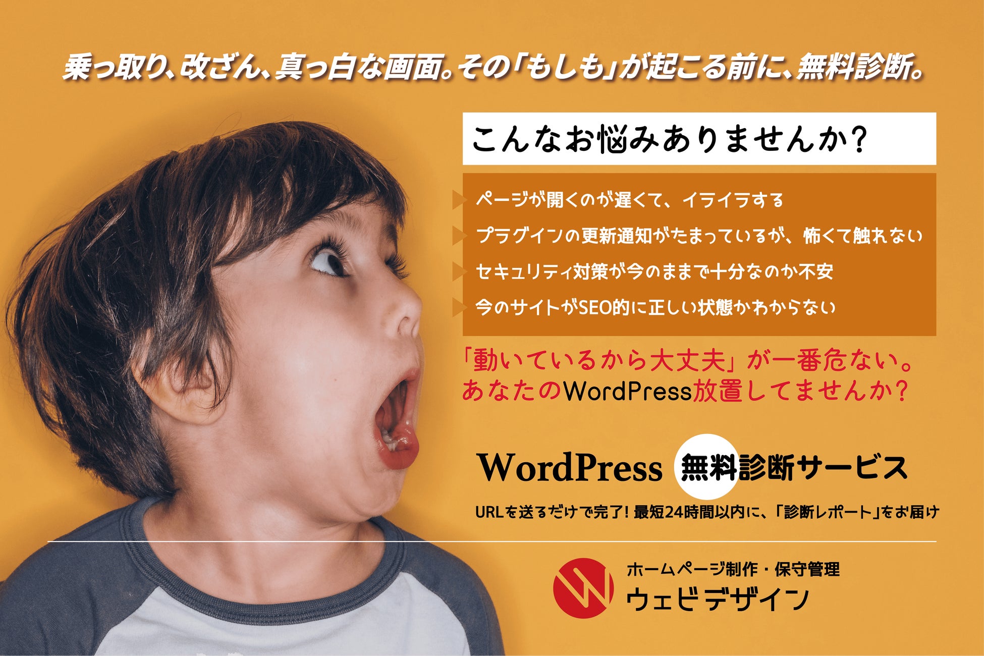 京都でWeb制作・保守管理を行う「ウェビデザイン」(所在地:京都市西京区、代表:海老瀬 清一)は、運用中のWordPressサイトに潜むセキュリティリスクや表示速度、SEOの問題点を無料で可視化する「WordPress無料診断サービス」の提供を開始いたしました。