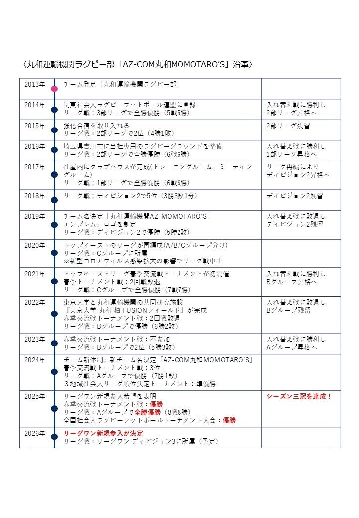 リーグワン参入は、チームが更なる高みを目指す新たな挑戦であり、大きな節目でもあります。AZ-COM丸和MOMOTARO’Sは、株式会社丸和運輸機関がチームの母体です。丸和運輸機関という社名に「機関」という言葉を使ったのは、業界の中心、心臓部、№1になりたいという創業者としての思いを込めて命名いたしました。この思いはラグビー活動においても同じです。いずれはリーグワンで№1になることを目指します。日本ラグビーの最高峰で試合ができることは選手たちには最高の喜びであり運営会社としても光栄なことです。しかしこの新たなステージでは、これまで以上に厳しい戦いを覚悟しております。それでも私たちはAZ-COM丸和グループ一丸となってこの挑戦に全力を尽くしてまいります。