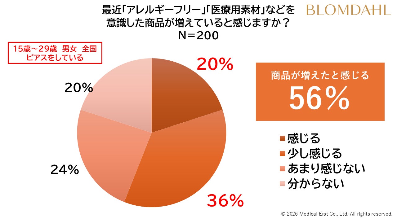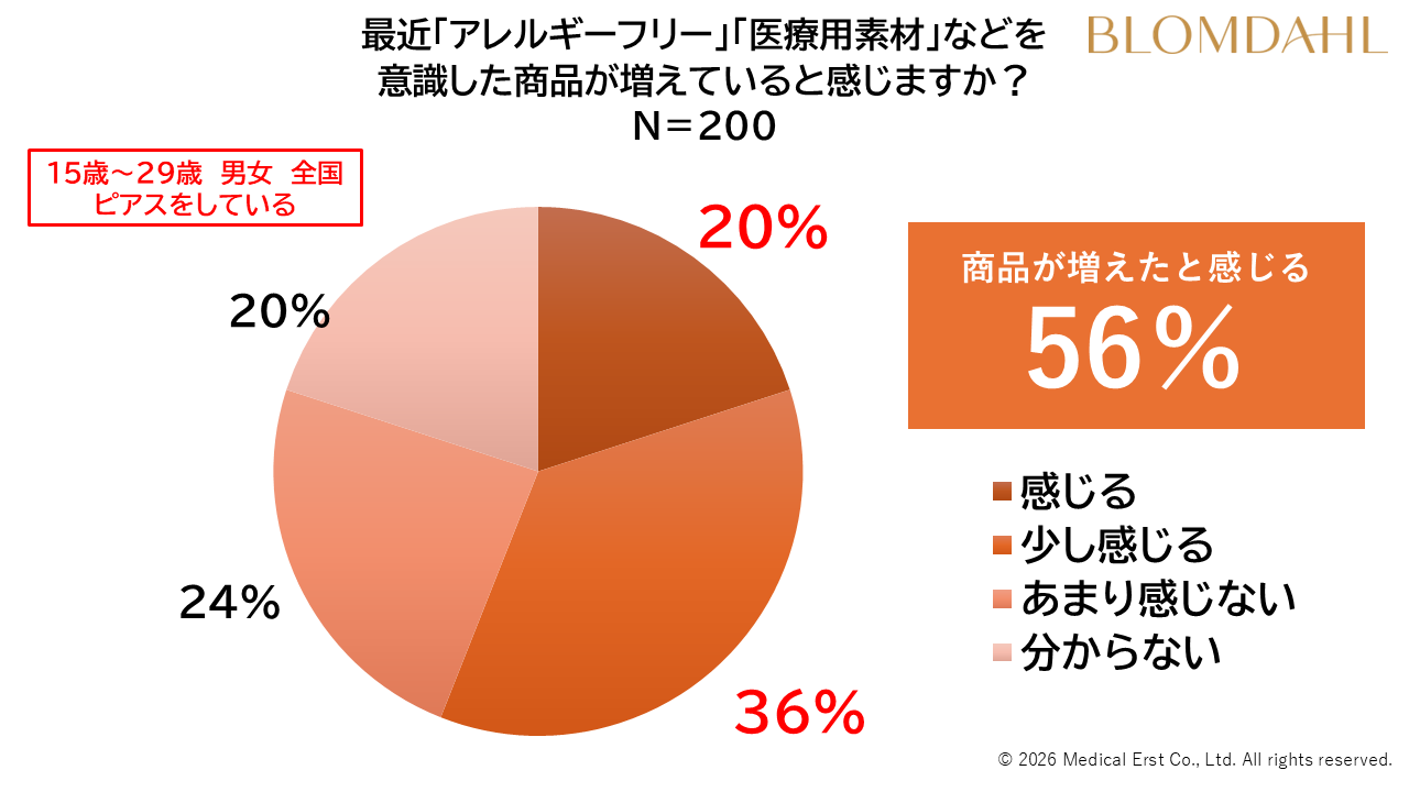 調査によると、アレルギーフリーピアスの存在自体は一定の認知があるものの、「商品が増えたと感じる」と答えた人は56%に留まっています。市場にモノは溢れていても、消費者が自分にとって安全な選択肢が増えたという実感を持つには至っていない実態があります。