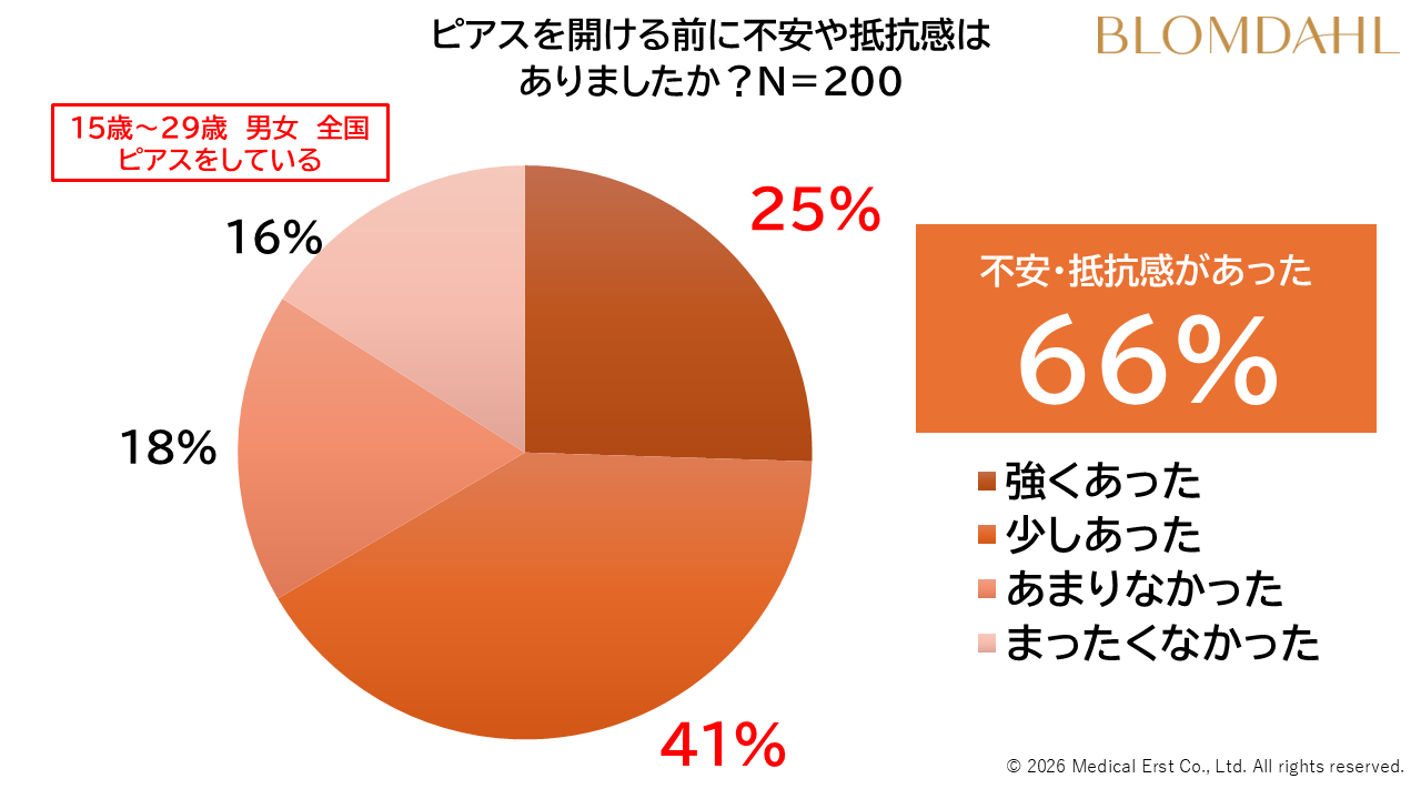 また、ピアスを開けた有効回答数200名に対して、ピアスを開ける際の心理についても調査結果が示されました。「強く不安」25.5%、「少し不安」41%で、合計66.5%が不安を抱えながら開けていることが分かりました。
