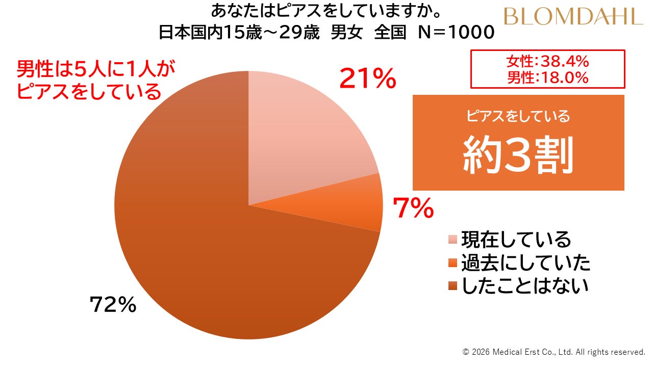 全国の15歳~29歳の男女1000人を対象に実施した調査では、ピアスを「現在している」が21%、「過去にしていた」が7%となり、経験者は合計28.2%(約3割)にのぼりました。男性に限ると18.0%で、約5人に1人がピアスを経験している結果となっています。