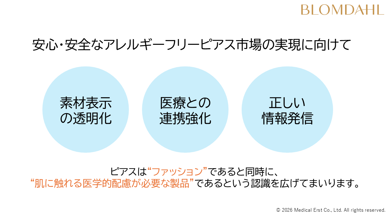 アレルギーフリーピアスのグローバルブランド“BLOMDAHL(ブロムダール)”国内正規代理店であるメディカルエルスト株式会社(東京本社:東京都文京区 代表取締役社長:松川祐二)は2026年2月25日、東京都文京区の本社にて医師・海外メーカーらを招いたメディア向けトークイベントを開催しました。若年層でピアス文化が広がるなか、その裏側で見過ごされがちな金属アレルギーリスクが浮き彫りになりました。一方で、高温多湿の日本では金属アレルギー発症リスクが高まりやすいとの指摘があり、海外でも「ニッケルフリー」表示のあり方が課題となっています。