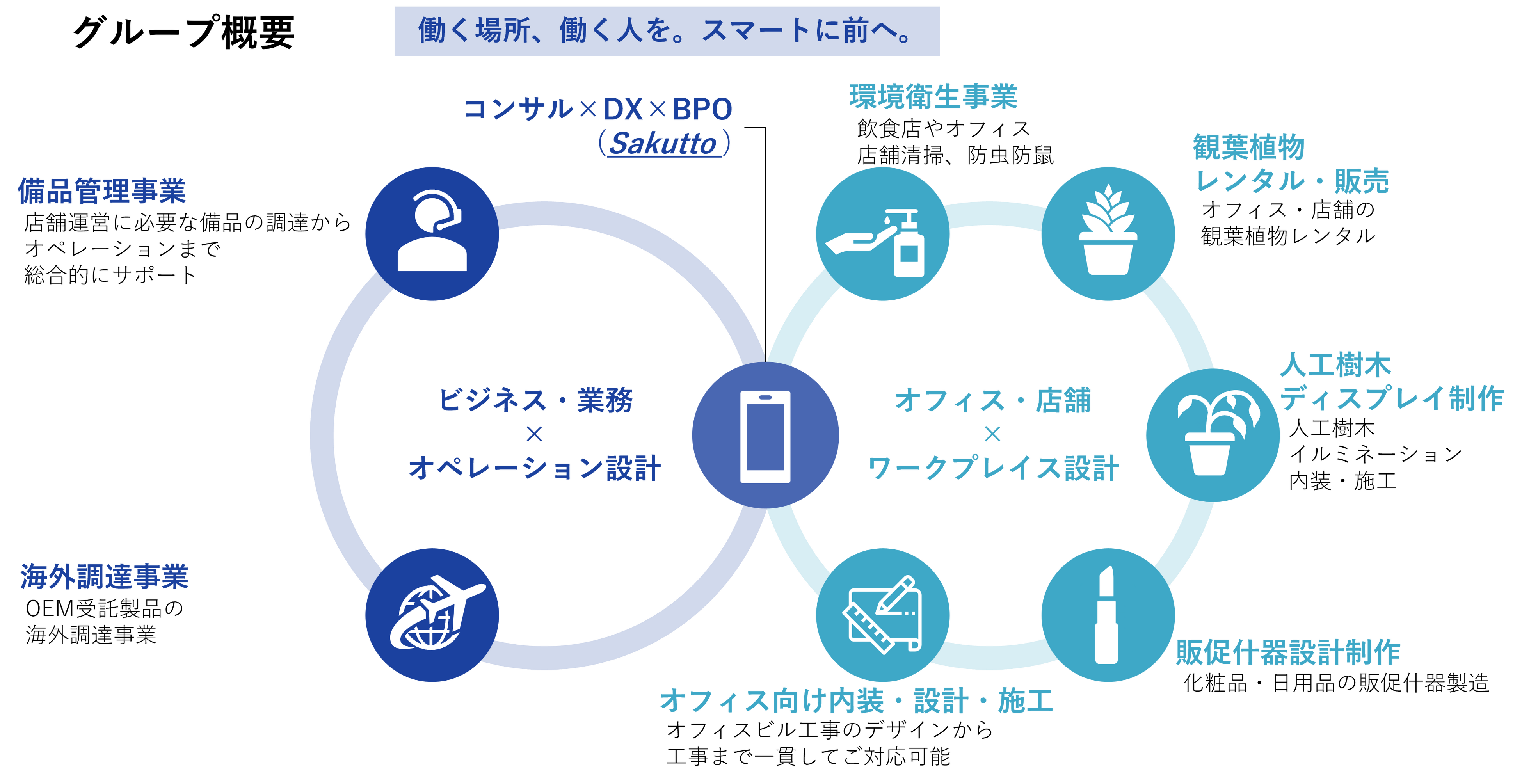 備品発注・海外調達事業・環境衛生事業・バックオフィス支援を起点に、業務BPOおよびDX設計を担う中核会社。グループ全体で蓄積された業務ノウハウをもとに、Sakuttoの企画・設計・運用を行っています。