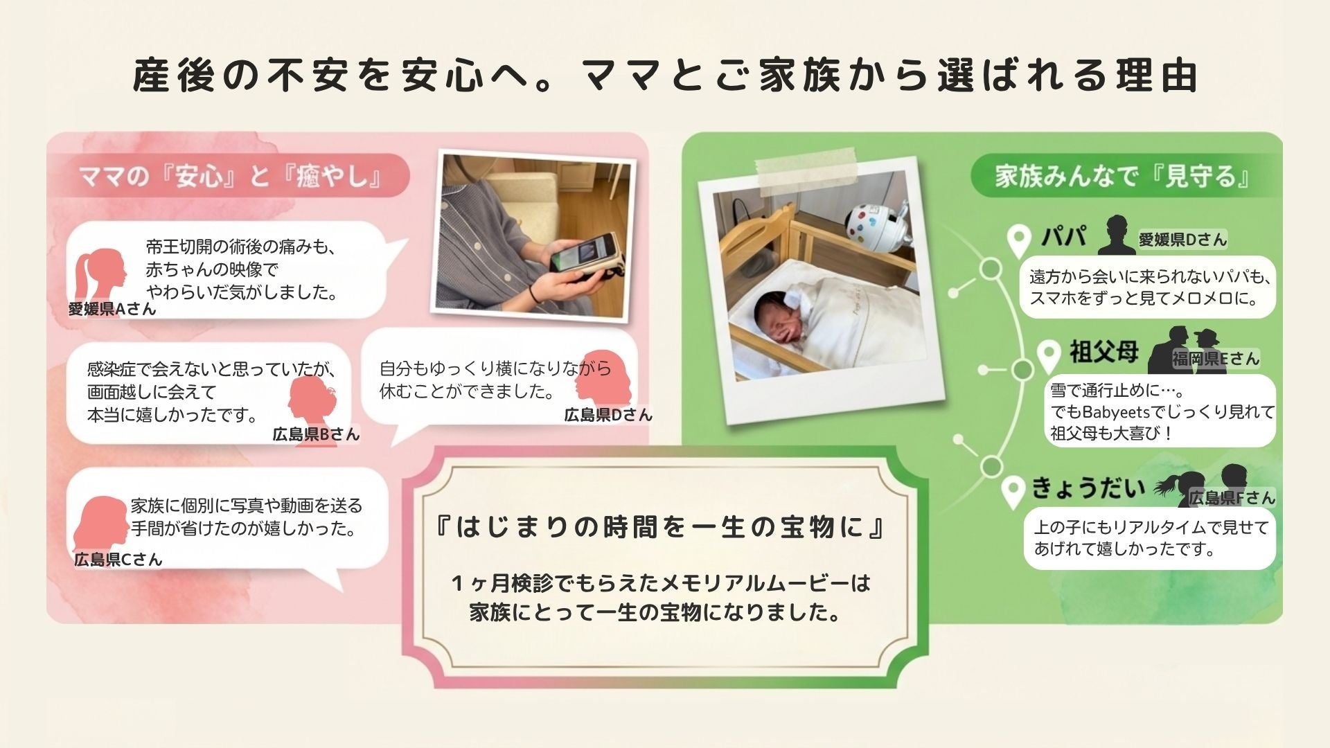「Babyeets」は、医療機関専用に設計されたクラウドカメラを活用し、新生児の様子を、 安全かつリアルタイムで家族に配信するサービスです。