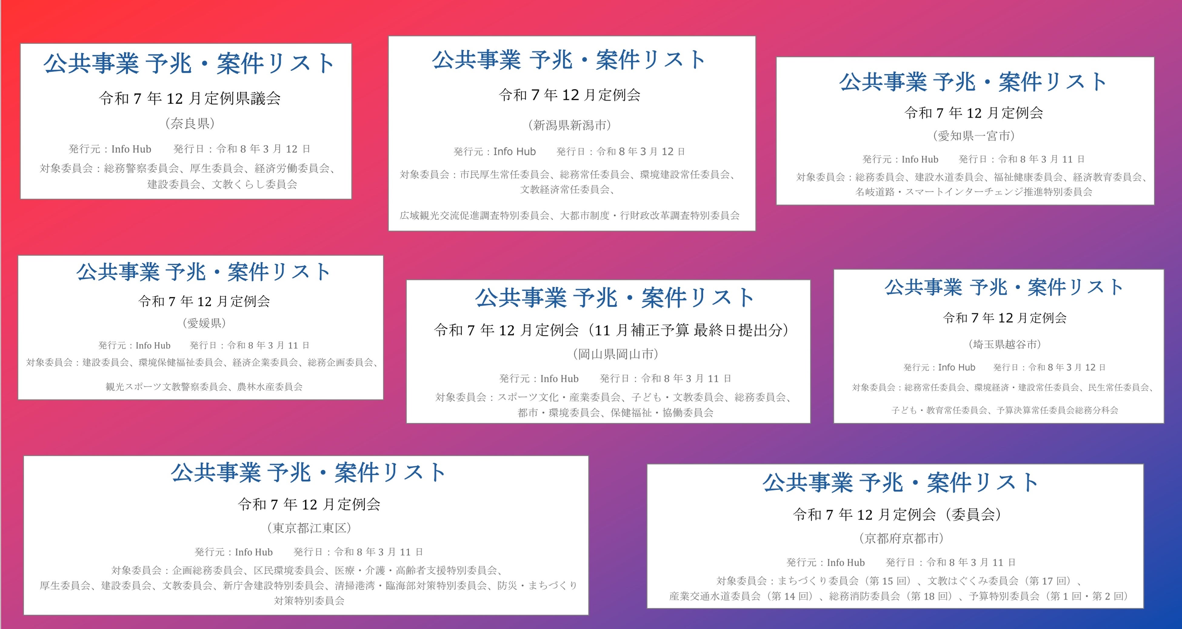 建設・公共ビジネス特化型の新規案件探索サービス「Info Hub」のローンチを記念して、「公共事業 予兆・案件リスト」【1ヶ月間】の無料利用キャンペーンを実施します。