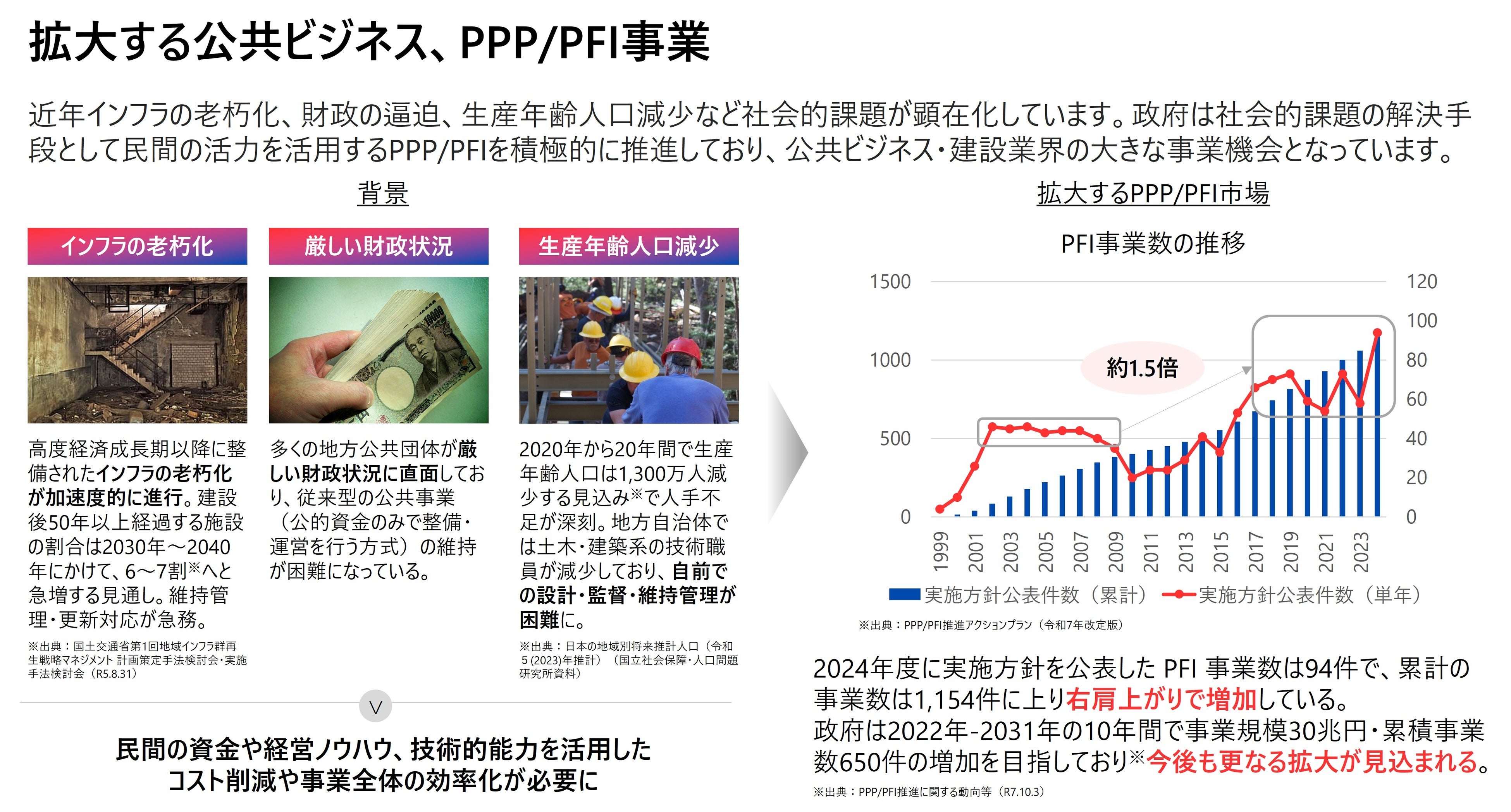 こうした社会的課題の解決手段として、民間の資金や経営ノウハウを活用するPPP/PFI(官民連携/民間資金活用事業)事業は拡大を続けています。2024年度に実施方針を公表したPFI事業数は94件、累計事業数は1,154件に達しました。政府は2022年から2031年の10年間で事業規模30兆円、累積事業数650件の増加を目標に掲げており(※3)、今後もさらなる拡大が見込まれます。