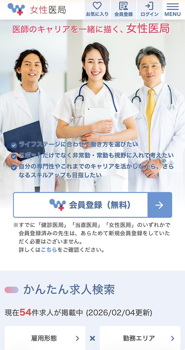 今回の統合により、健診・婦人科検診・当直アルバイトなどのスポット勤務から、定期非常勤・常勤まで、医師の働き方に関する情報と機能を「女性医局」サイトへ集約してまいります。