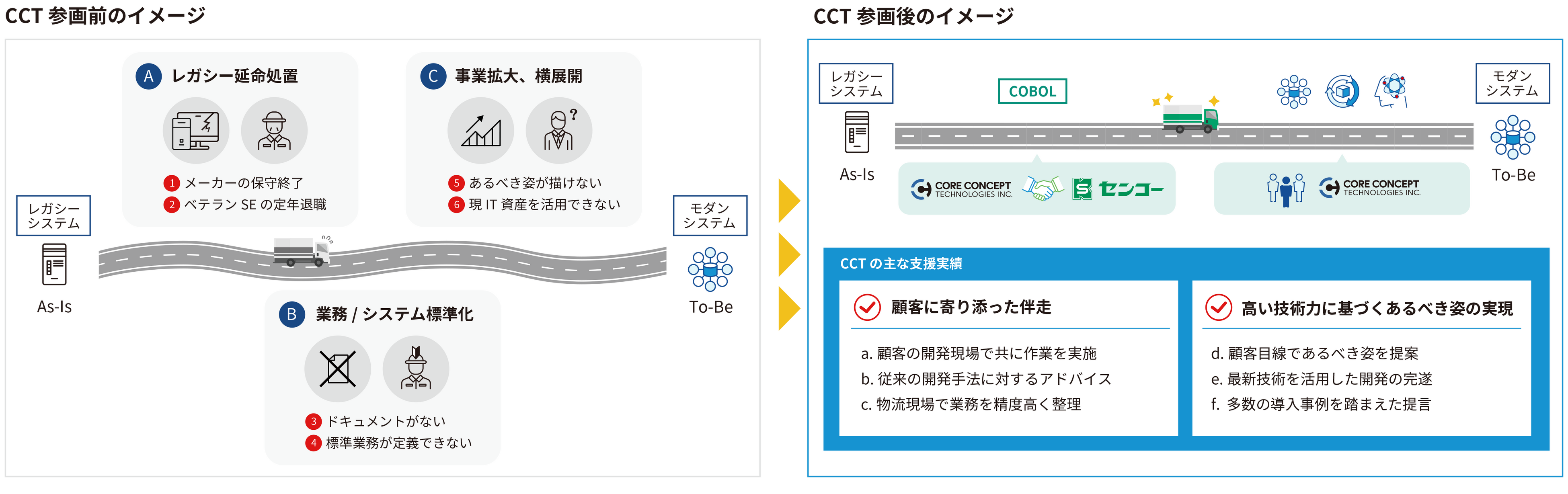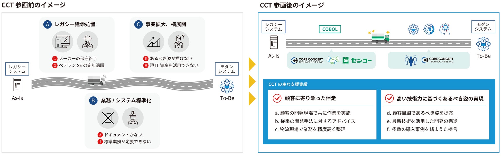 DX支援を手がける株式会社コアコンセプト・テクノロジー(本社:東京都豊島区、代表取締役社長CEO:金子 武史、以下「CCT」)は、1916年創業の総合物流大手、センコー株式会社(本社:大阪市北区、代表取締役社長:大越 昇、以下「センコー」)が進める「業務標準化DXプロジェクト」において、伴走型PMO(Project Management Office)として参画したことをお知らせいたします。