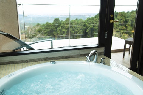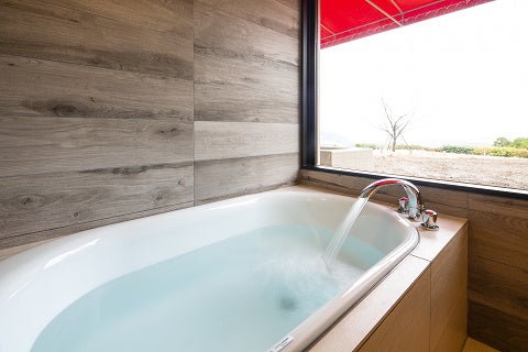 3階は、スイートとして設計された最上階で、西原村の風景を最も遠くまで見渡すことができる一室です。大きく開かれた窓からは、空と大地がひと続きに広がり、滞在そのものが風景の中へと溶け込んでいくような感覚をもたらします。また、ジャグジーを備えており、景色とぬくもりに包まれながら、時間の流れをよりゆるやかに感じることができます。光や時間の移ろいがそのまま室内に重なり、ただ過ごすことが、この場所の風景を味わうことへとつながっていきます。縷々の中で最も開放感と静けさが調和した客室です。